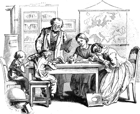 The old schoolmaster is busy with his pupils this afternoon, and is reading something which they are writing out. Some of the words puzzle little Joseph, and he does not know how to spell them. His tiny brother, who sits at his side, is making straight strokes.