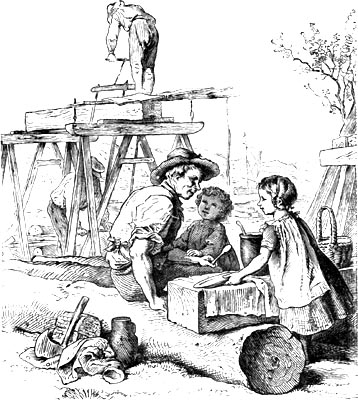 It is dinner-time, and the children have just brought their father’s dinner to the saw-pit, and are spreading a clean cloth for him on a large log of wood.