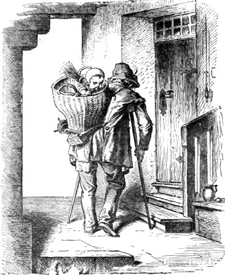 The poor old man is hobbling along from door to door, to see if he can sell anything.