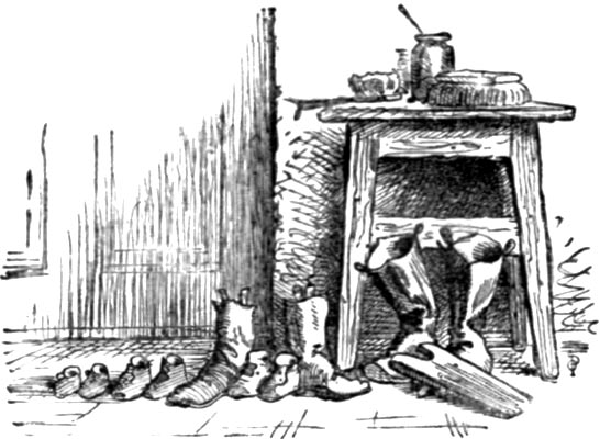 This is our boot cupboard, where we keep the blacking and brushes, and papa’s boot-jack. I will tell you whom they belong to, all these five pairs. The tall big ones belong to dear papa, as you may suppose, and are strong ones, as he has to walk very much. Mama’s boots are not kept here, but in her own bed-room. Then the next tall pair belong to brother Richard, and are almost as large as papa’s. The pair between Richard’s boots belong to sister Mary; and the pair nearer the door, to little Susan. The tiny pair next the door, are dear little baby’s, but they are not of much use to him, for his fat little feet need a larger pair.