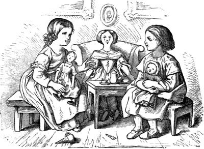 This is dolly’s party. The two little girls have been invited to tea with her, and they have each brought their dolls with them. I hope it will be a pleasant party, though of course our two little friends must do all the talking, as Miss Dolly, though she sits there in such state, cannot speak a single word. But I dare say they can talk for her and themselves too.