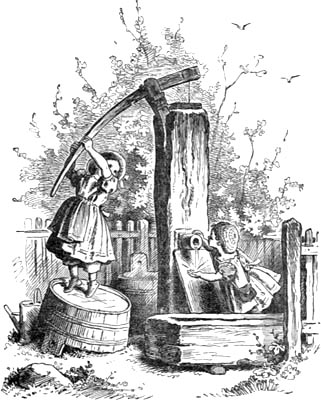 Lucy is trying to pump up some water for her little sister, but she should be careful, for the water may run out suddenly and wet little Mary’s dress. If this happens mama will be angry, for her dress is a very nice one indeed, and almost new.