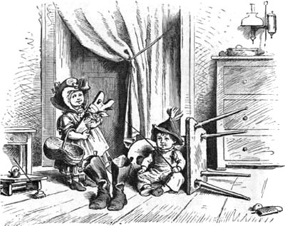 Little Richard has been dressing himself up in some old clothes, and has got a big walking-stick. His brother is amused, but baby does not seem to know him.