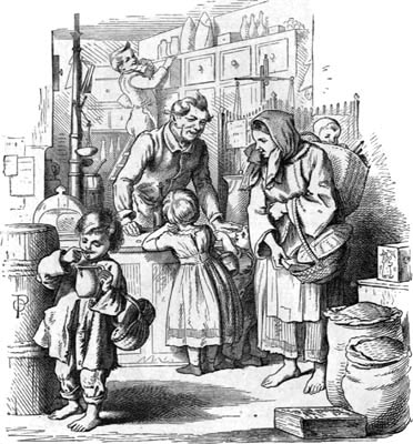 Mr. Sweet, the grocer, is serving his customers. James has just had some treacle, but he has put his finger into the jug, and is sucking it. Naughty boy!