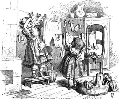 It is a very serious affair when the day comes round to do dolly’s washing. Lines are hung up in the nursery, with a great tub to hold the wet clothes, and, after that, they are hung across the lines to dry. Our two little friends are as busy as they can be, and they must make haste, for papa would not like to find his little girls absent when he comes home.