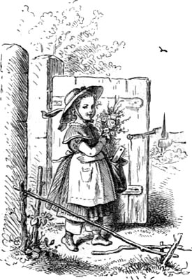 Little Laura has just opened the garden gate, and is hurrying off to school. She has a nosegay in her hand, which she is taking to her governess, whom she is very fond of. I dare say the governess will like her little present, for every one is fond of flowers, and still more the kindness which prompted her to bring it.