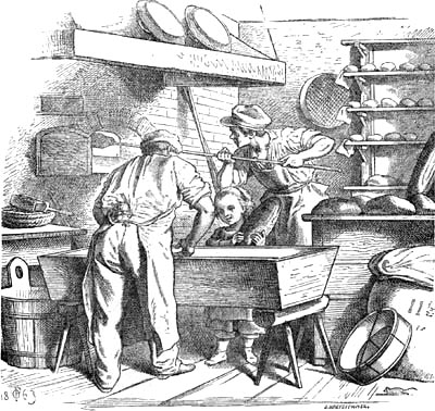 Mary has come to the baker’s to buy a new loaf this morning, and she has peeped into the bakery to see how the men make the bread. She must not stay long though, for they are all waiting at home to have their breakfast.