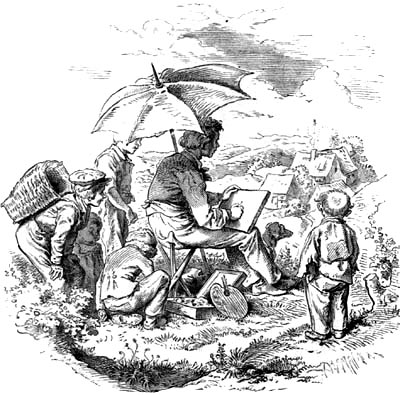 The artist is sitting on a camp-stool, taking a sketch of the cottages yonder. He has put up his umbrella to shelter himself from the sun. The boys seem greatly interested in his work.