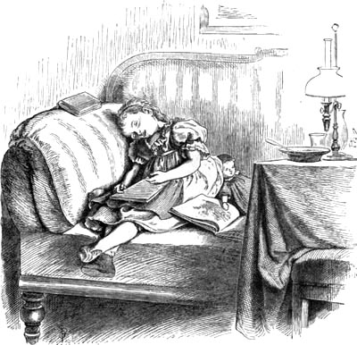 Maria has been sitting on the sofa this evening, looking through some picture books. But it is late, and mama has not yet come home, and she has fallen fast asleep with dolly behind her.