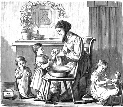 Mama does not like to see her children dirty, so she is washing their hands, and then they can play about again. Baby is looking at his hands to see if they are dirty, and Alice is examining her doll’s hands.