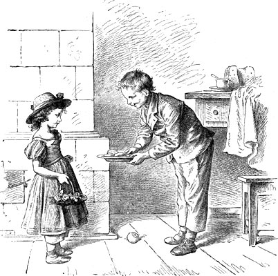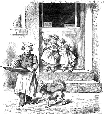 This is the shop of Mr. Sweet, the pastrycook. The children have just bought some sweets, and his lad is taking out a large cake on a tray.