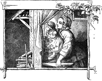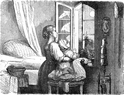 Mama is going to put baby to bed, but she is taking her first to the window to show her how dark it is. And now baby must go to bed, for it is late. The little birds are already asleep beneath the roof, for they go to rest early at night, and rise very early in the morning. It is not so dark as this every night, but to-night the moon is not visible.