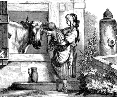 The cow is a quiet creature, and is one of the most useful of all animals. We have to thank the cow for our nice milk, and fresh butter. Mary often carries baby to the window of the cow-shed, and baby takes hold of the cow’s horn, it is so harmless and gentle.
