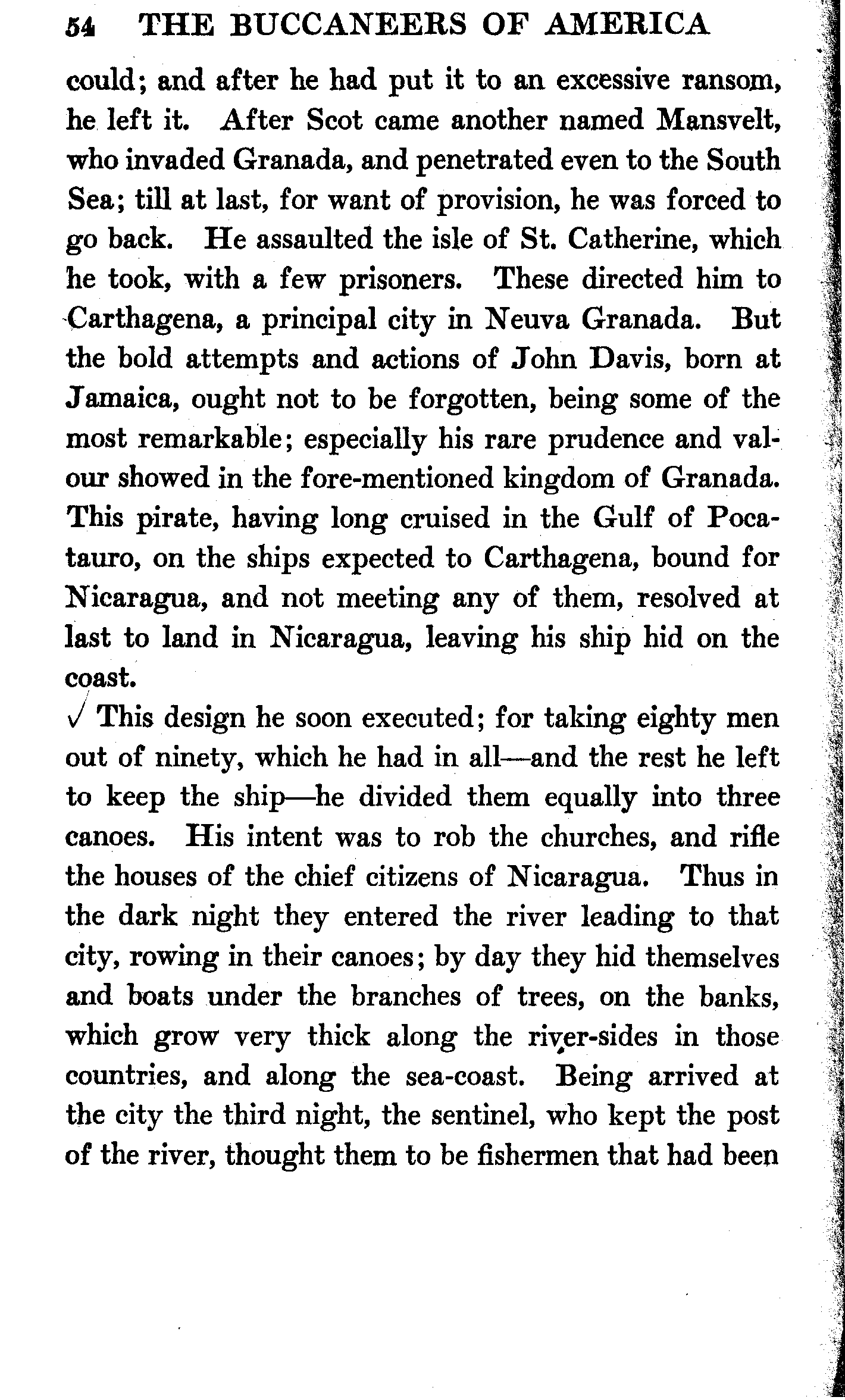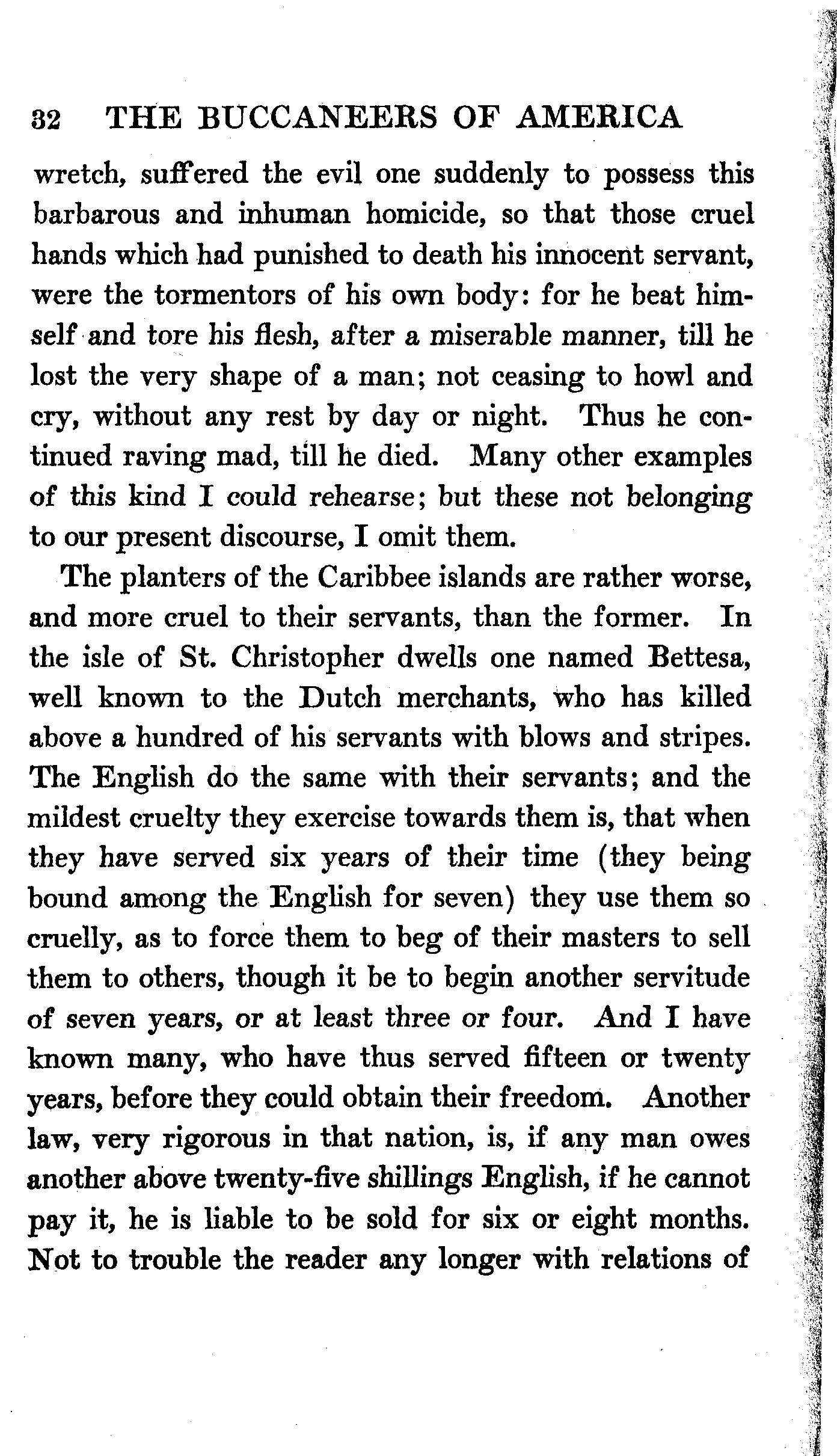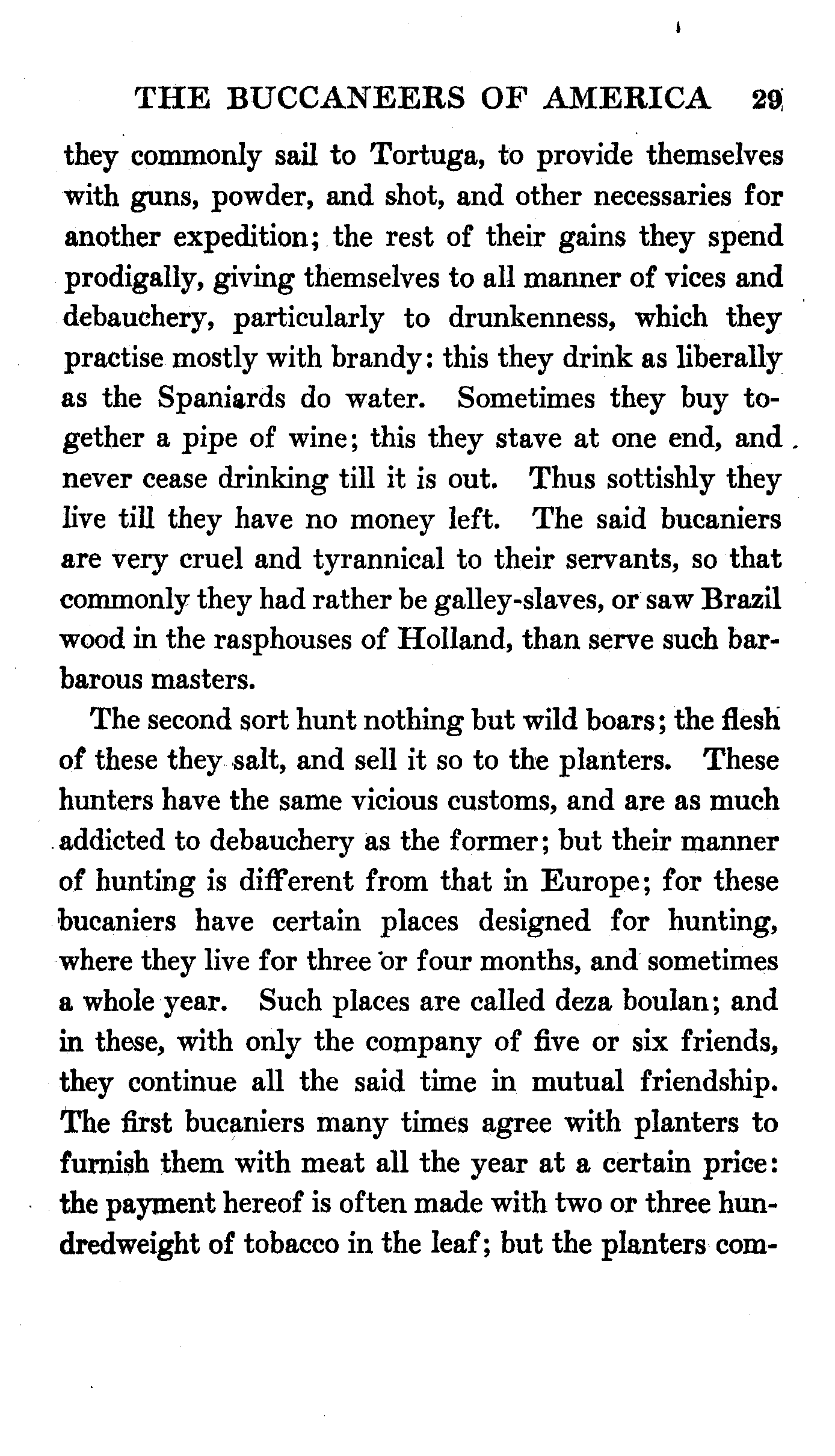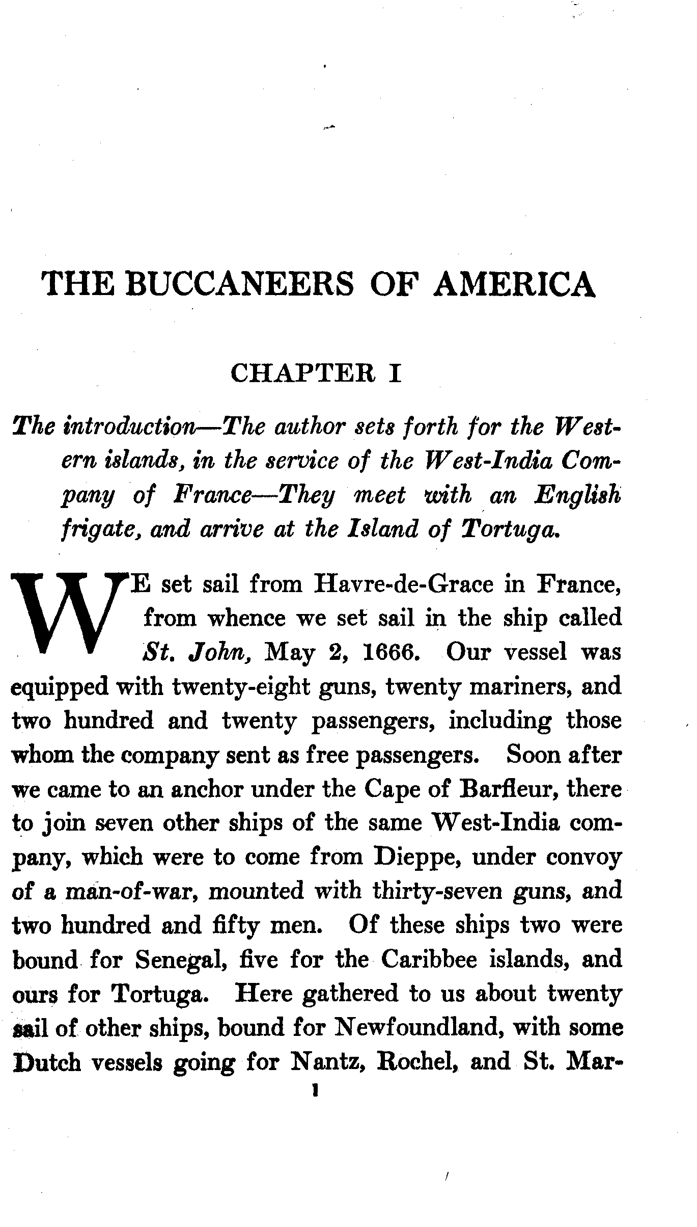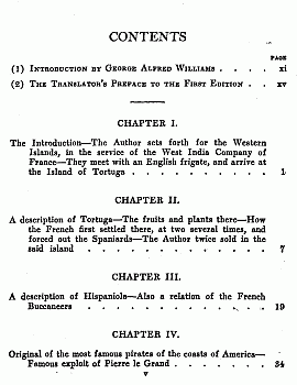 Of the author, John Esquemeling, very little is known although it is generally conceded that he was in all probability a Fleming or Hollander, a quite natural supposition as his first works were written in the Dutch language. He came to the island of Tortuga, the headquarters of the Buccaneers, in 1666 in the employ of the French West India Company. Several years later this same company, owing to unsuccessful business arrangements, recalled their representatives to France and gave their officers orders to sell the company's land and all its servants. Esquemeling then a servant of the company was sold to a stern master by whom he was treated with great cruelty. Owing to hard work, poor food and exposure he became dangerously ill, and his master seeing his weak condition and fearing to lose the money Esquemeling had cost him resold him to a surgeon.[xii] This new master treated him kindly so that Esquemeling's health was speedily restored, and after one year's service he was set at liberty upon a promise to pay his benefactor, the surgeon, 100 pieces of eight at such a time as he found himself in funds.