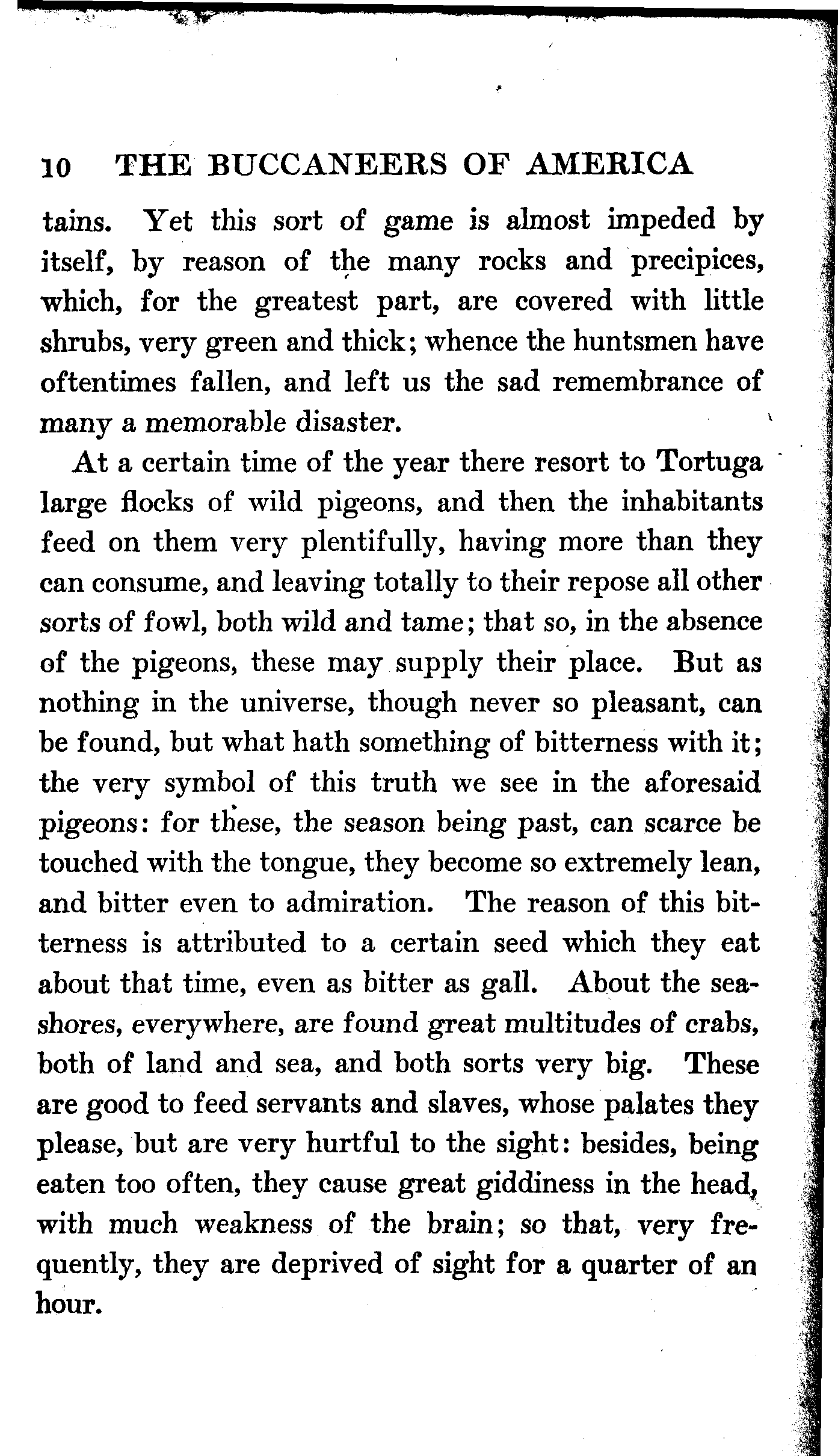 At a certain time of the year there resort to Tortuga large flocks of wild pigeons, and then the inhabitants feed on them very plentifully, having more than they can consume, and leaving totally to their repose all other sorts of fowl, both wild and tame; that so, in the absence of the pigeons, these may supply their place. But as nothing in the universe, though never so pleasant, can be found, but what hath something of bitterness with it; the very symbol of this truth we see in the aforesaid pigeons: for these, the season being past, can scarce be touched with the tongue, they become so extremely lean, and bitter even to admiration. The reason of this bitterness is attributed to a certain seed which they eat about that time, even as bitter as gall. About the sea-shores, everywhere, are found great multitudes of crabs, both of land and sea, and both sorts very big. These are good to feed servants and slaves, whose palates they please, but are very hurtful to the sight: besides, being eaten too often, they cause great giddiness in the head, with much weakness of the brain; so that, very frequently, they are deprived of sight for a quarter of an hour.[11]