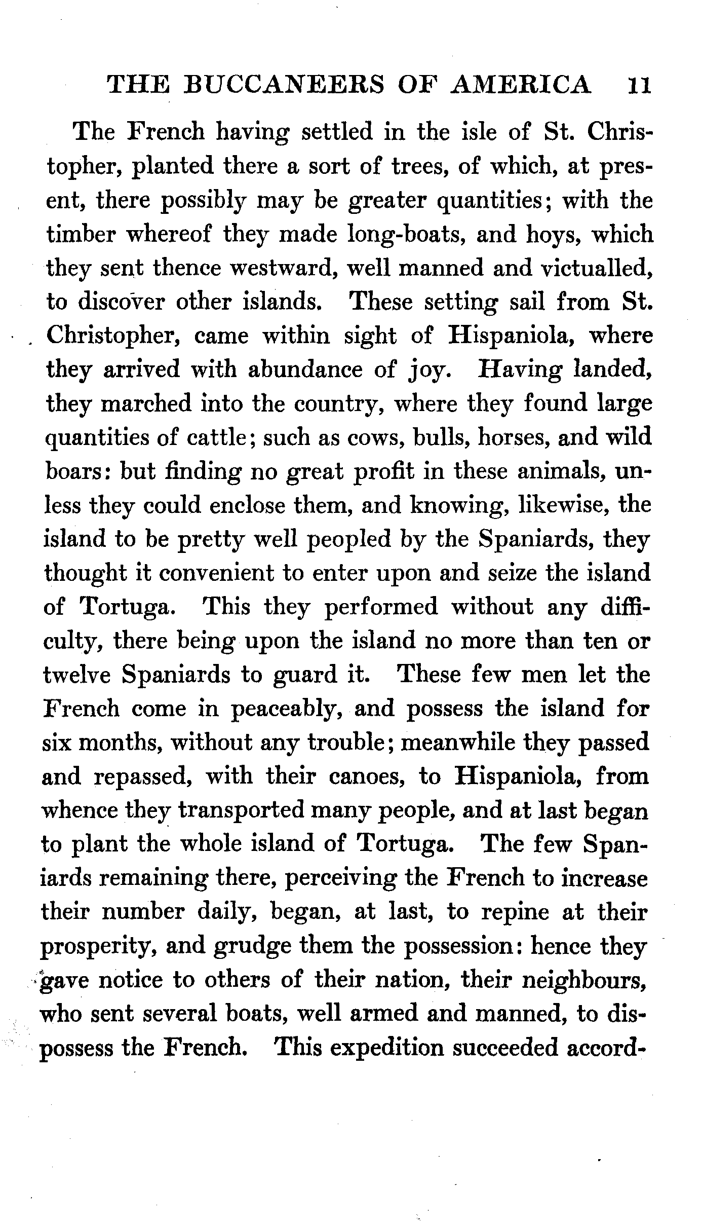 The French having settled in the isle of St. Christopher, planted there a sort of trees, of which, at present, there possibly may be greater quantities; with the timber whereof they made long-boats, and hoys, which they sent thence westward, well manned and victualled, to discover other islands. These setting sail from St. Christopher, came within sight of Hispaniola, where they arrived with abundance of joy. Having landed, they marched into the country, where they found large quantities of cattle; such as cows, bulls, horses, and wild boars: but finding no great profit in these animals, unless they could enclose them, and knowing, likewise, the island to be pretty well peopled by the Spaniards, they thought it convenient to enter upon and seize the island of Tortuga. This they performed without any difficulty, there being upon the island no more than ten or twelve Spaniards to guard it. These few men let the French come in peaceably, and possess the island for six months, without any trouble; meanwhile they passed and repassed, with their canoes, to Hispaniola, from whence they transported many people, and at last began to plant the whole island of Tortuga. The few Spaniards remaining there, perceiving the French to increase their number daily, began, at last, to repine at their prosperity, and grudge them the possession: hence they gave notice to others of their nation, their neighbours, who sent several boats, well armed and manned, to dispossess the French. This expedition succeeded accord[12]ing to their desires; for the new possessors, seeing the great number of Spaniards, fled with all they had to the woods, and hence, by night, they wafted over with canoes to the island of Hispaniola: this they the more easily performed, having no women or children with them, nor any great substance to carry away. Here they also retired into the woods, both to seek for food, and from thence, with secrecy, to give intelligence to others of their own faction; judging for certain, that within a little while they should be in a capacity to hinder the Spaniards from fortifying in Tortuga.