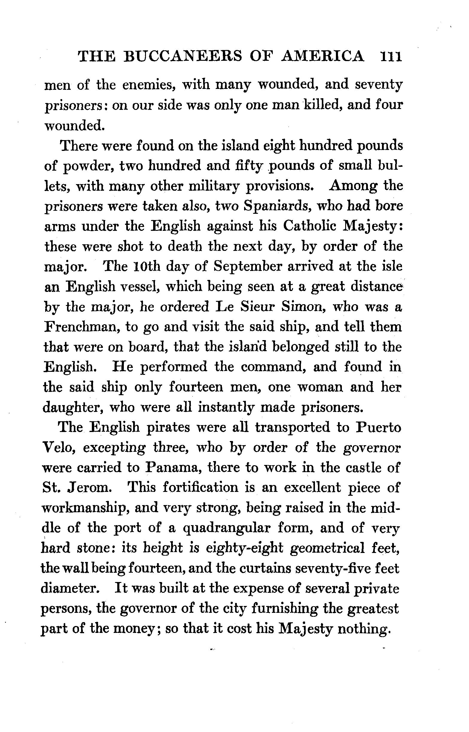 The taking of this castle cost the pirates excessively dear, in comparison to what they were wont to lose, and their toil and labour was greater than at the conquest of the isle of St. Catherine; for, numbering their men, they had lost above a hundred, beside seventy[193] wounded. They commanded the Spanish prisoners to cast the dead bodies of their own men from the top of the mountain to the seaside, and to bury them. The wounded were carried to the church, of which they made an hospital, and where also they shut up the women.
