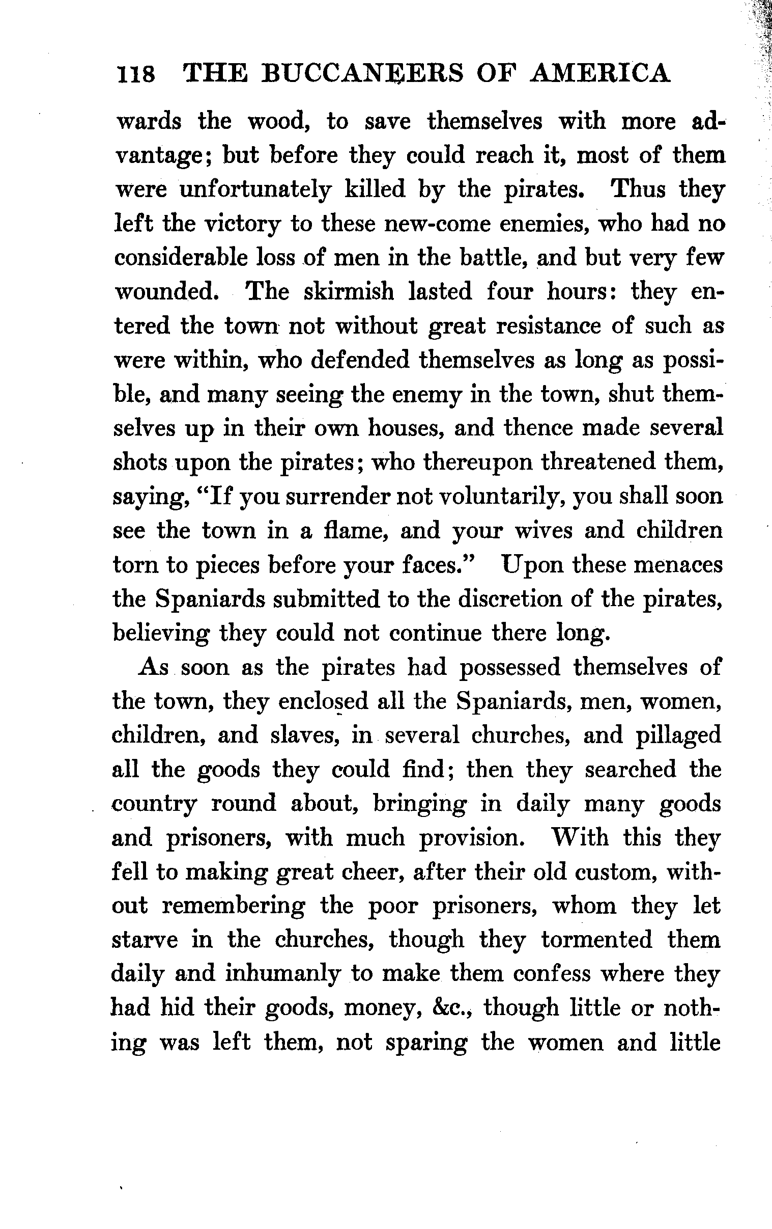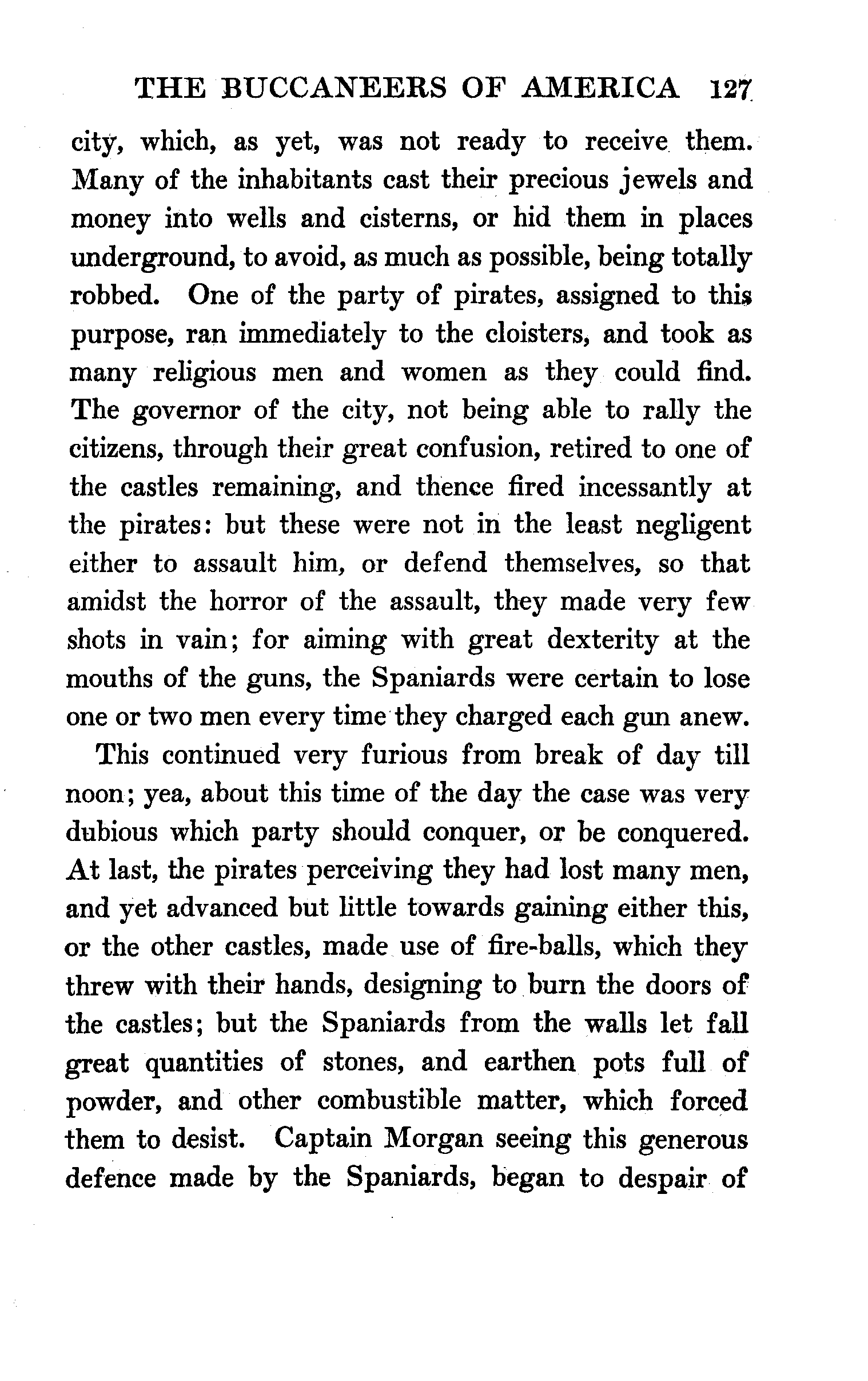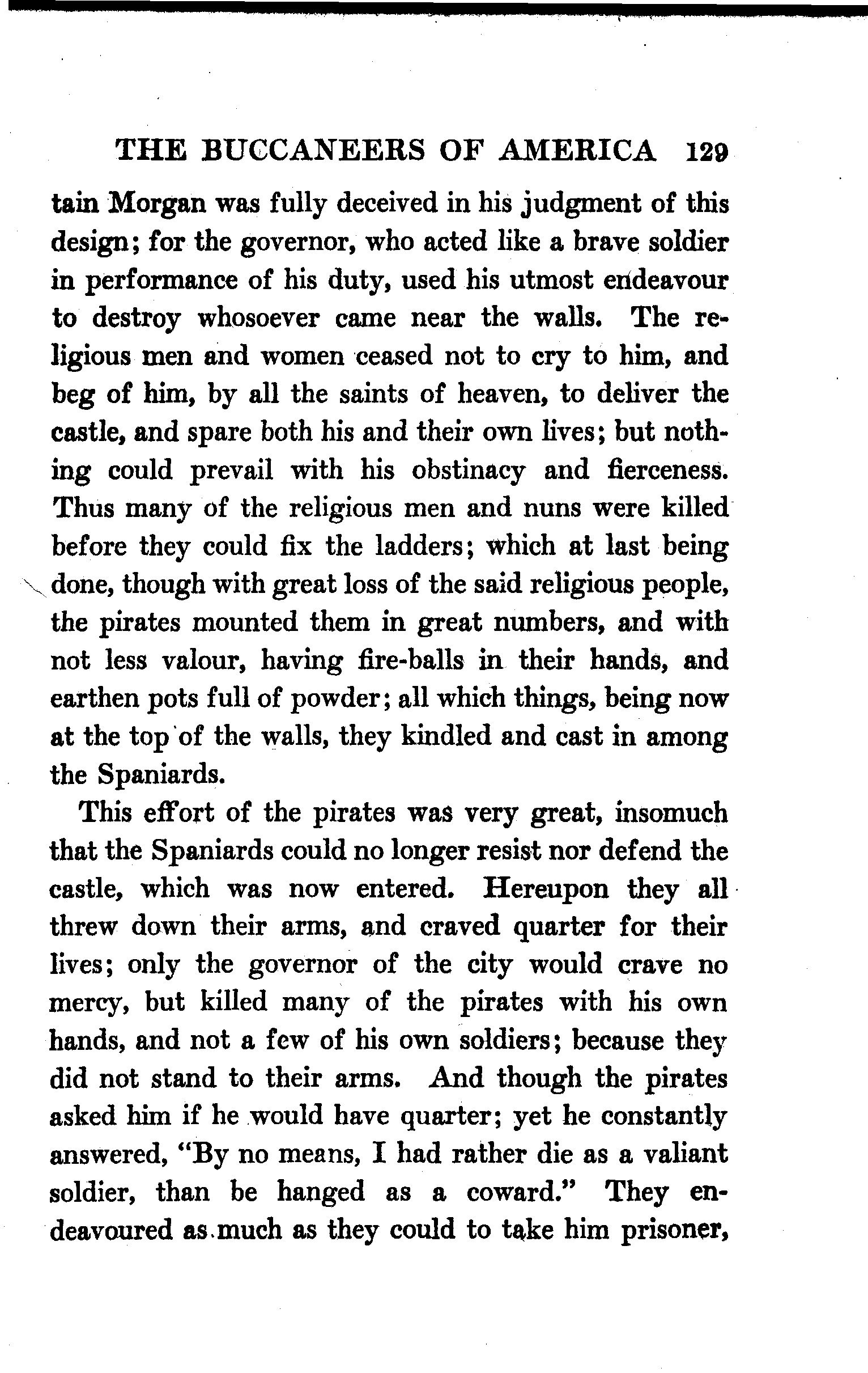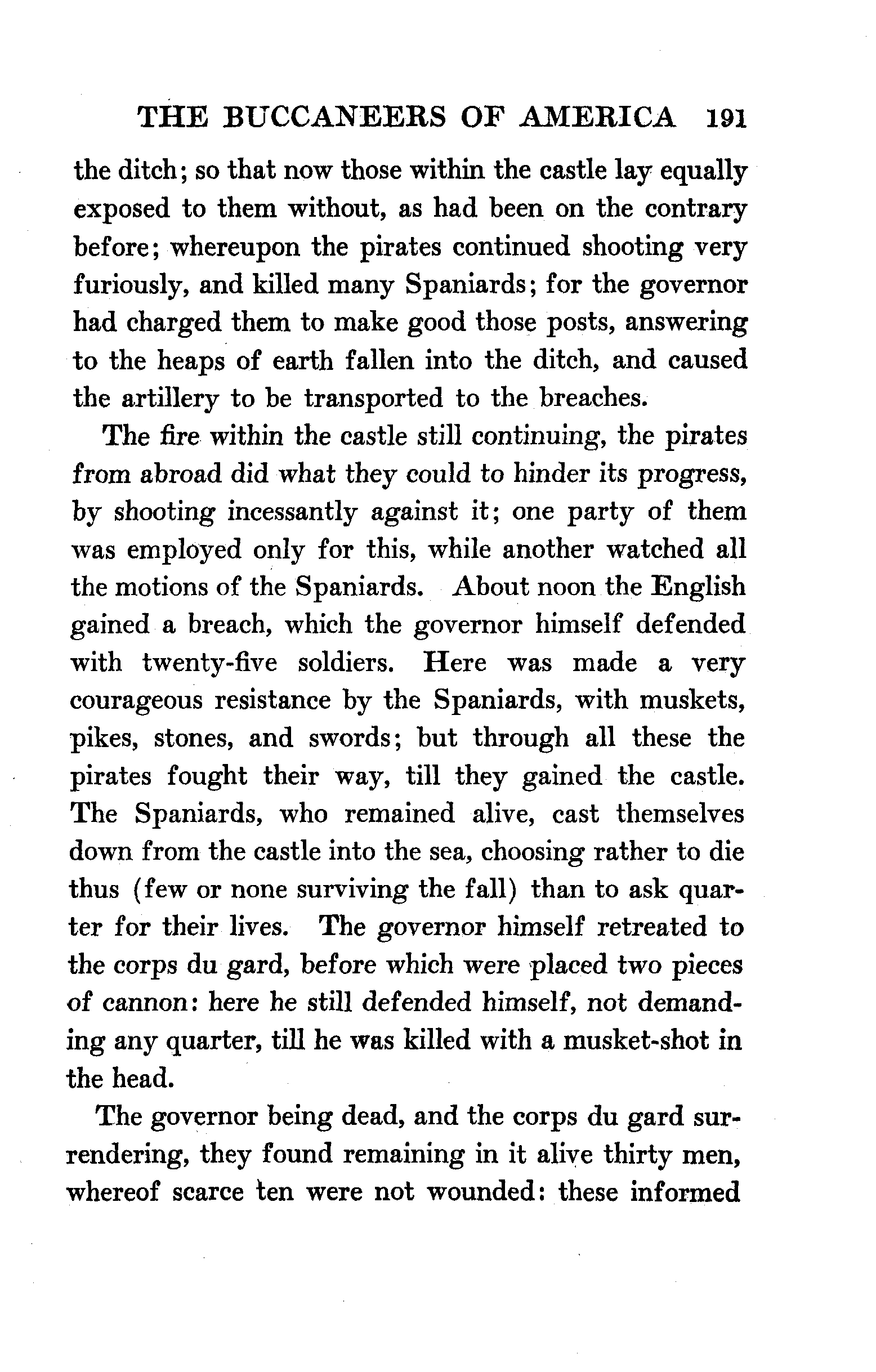 The fire within the castle still continuing, the pirates from abroad did what they could to hinder its progress, by shooting incessantly against it; one party of them was employed only for this, while another watched all the motions of the Spaniards. About noon the English gained a breach, which the governor himself defended with twenty-five soldiers. Here was made a very courageous resistance by the Spaniards, with muskets, pikes, stones, and swords; but through all these the pirates fought their way, till they gained the castle. The Spaniards, who remained alive, cast themselves down from the castle into the sea, choosing rather to die thus (few or none surviving the fall) than to ask quarter for their lives. The governor himself retreated to the corps du gard, before which were placed two pieces of cannon: here he still defended himself, not demanding any quarter, till he was killed with a musket-shot in the head.
