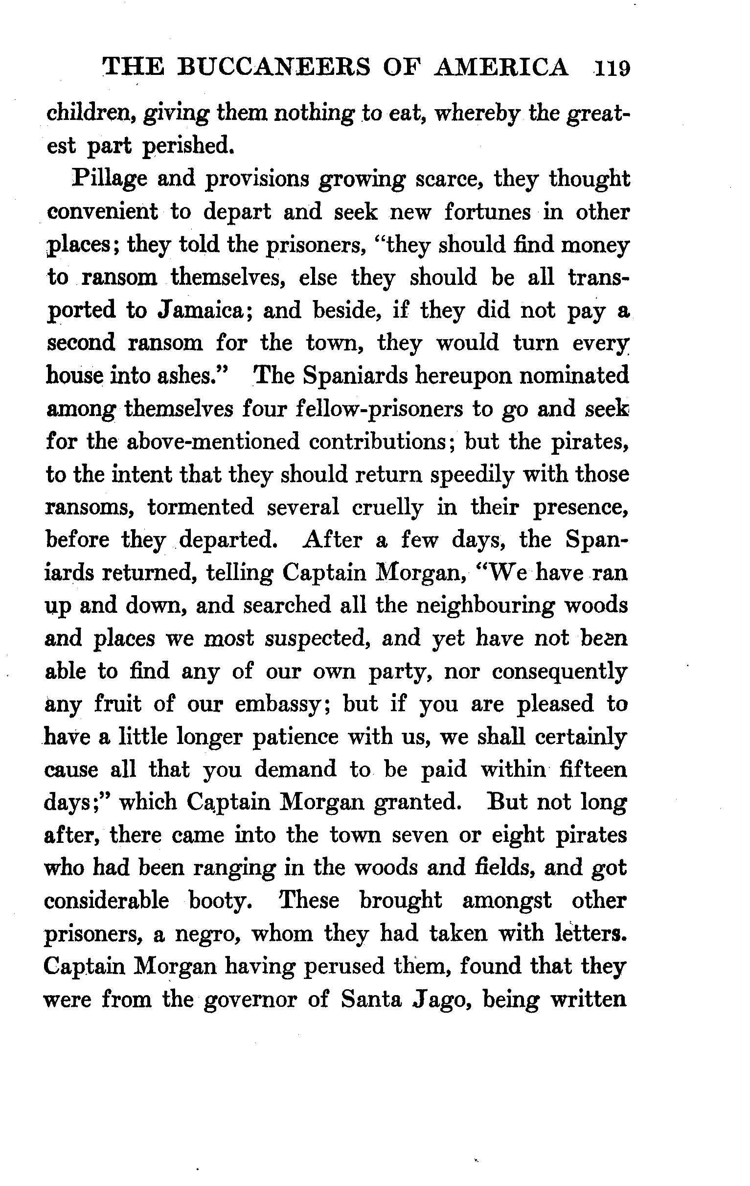 Captain Morgan arriving at the town called Cruz, on the banks of the river Chagre, he published an order among the prisoners, that within three days every one should bring in their ransom, under the penalty of being transported to Jamaica. Meanwhile he gave orders for so much rice and maize to be collected thereabouts, as was necessary for victualling his ships. Here some of the prisoners were ransomed, but many others could not bring in their money. Hereupon he continued his voyage, leaving the village on the 5th of March following, carrying with him all the spoil he could. Hence he likewise led away some new prisoners, inhabitants there, with those in Panama, who had not paid their ransoms.[224] But the two religious men, who had diverted the lady's money, were ransomed three days after by other persons, who had more compassion for them than they had showed for her.