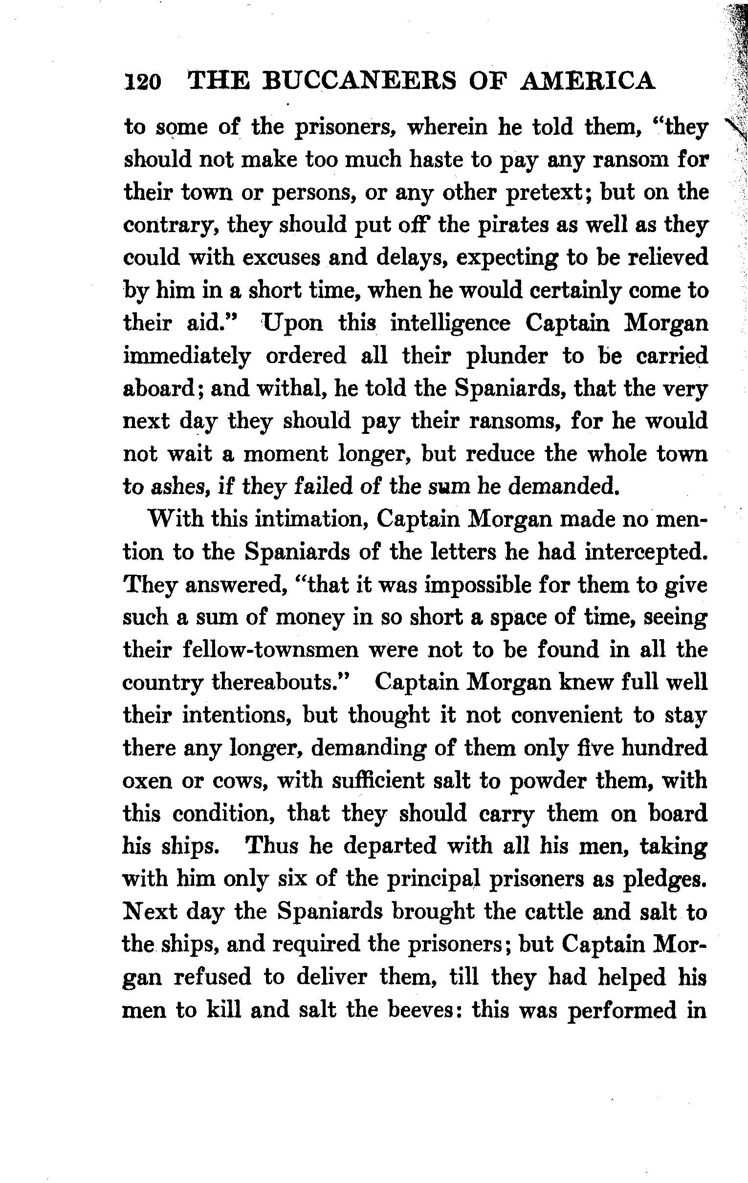 Hereupon, they sent to Captain Morgan, to know what sum he demanded. He answered, that on payment of 30,000 pieces of eight, and five hundred beeves, he would release the prisoners and do no damage to the town. At last they agreed on 20,000 pieces of eight, and five hundred beeves to victual his fleet. The cattle were brought the next day, with one part of the money; and, while the pirates were busied in salting the flesh, they made up the whole 20,000 pieces of eight, as was agreed.