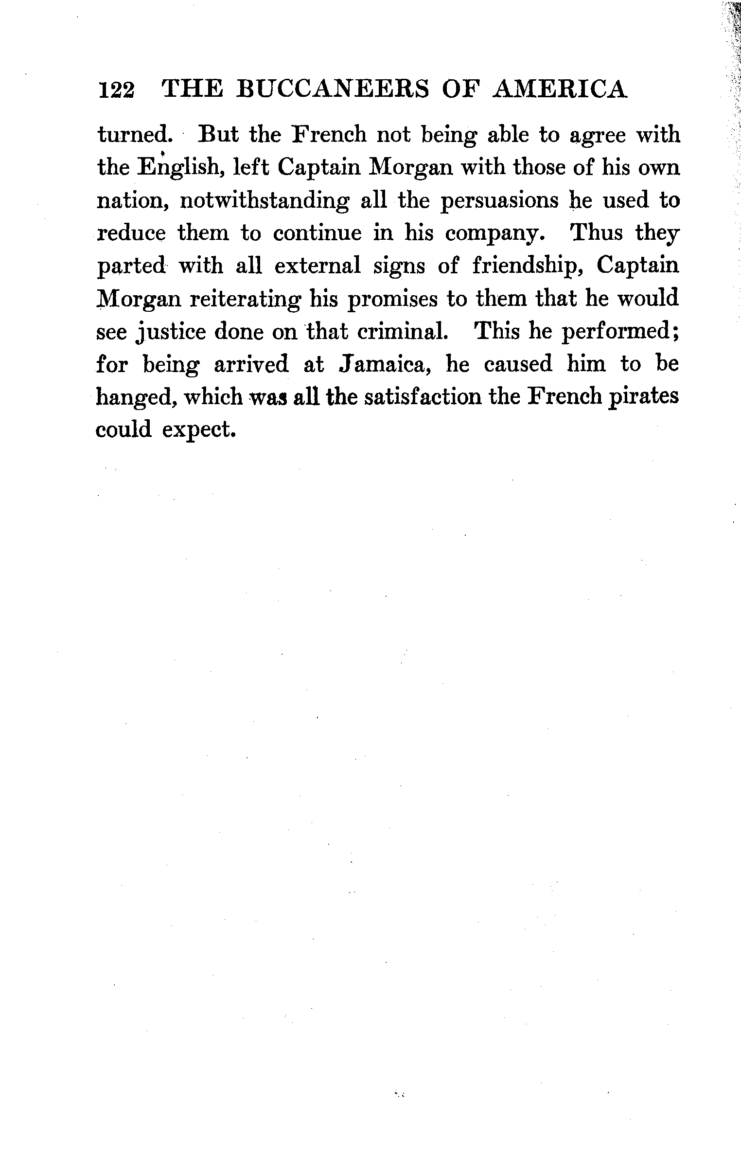 At last, finding himself obnoxious to many censures of his people, and fearing the consequence, he thought it unsafe to stay any longer at Chagre, but ordered the ordnance of the castle to be carried on board his ship; then he caused most of the walls to be demolished, the edifices to be burnt, and as many other things ruined as could be done in a short time. This done, he went secretly on board his own ship, without giving any notice to his companions, and put out to sea, being only[226] followed by three or four vessels of the whole fleet. These were such (as the French pirates believed) as went shares with Captain Morgan in the best part of the spoil, which had been concealed from them in the dividend. The Frenchmen could willingly have revenged themselves on Captain Morgan and his followers, had they been able to encounter him at sea; but they were destitute of necessaries, and had much ado to find sufficient provisions for their voyage to Jamaica, he having left them unprovided for all things.