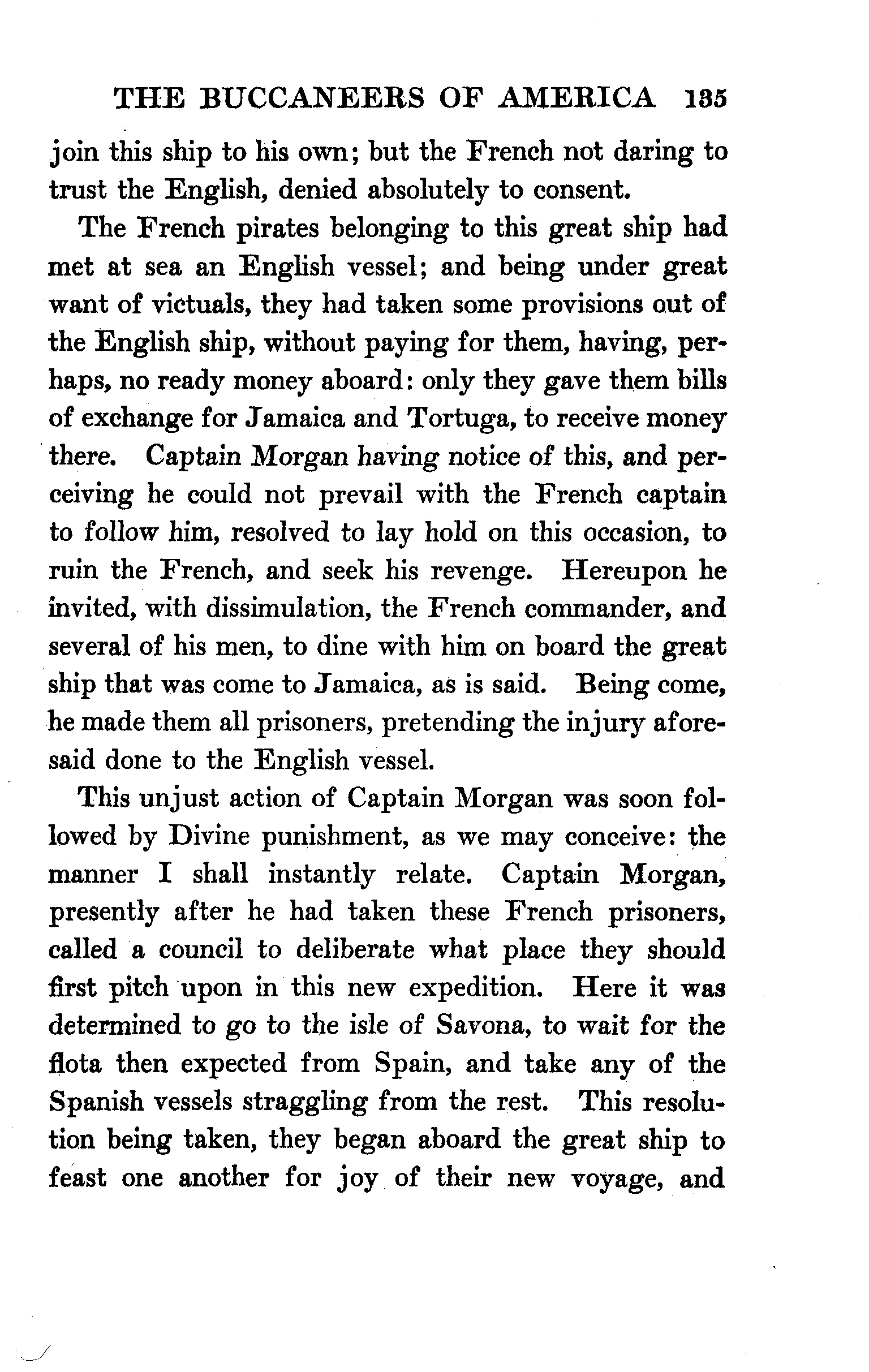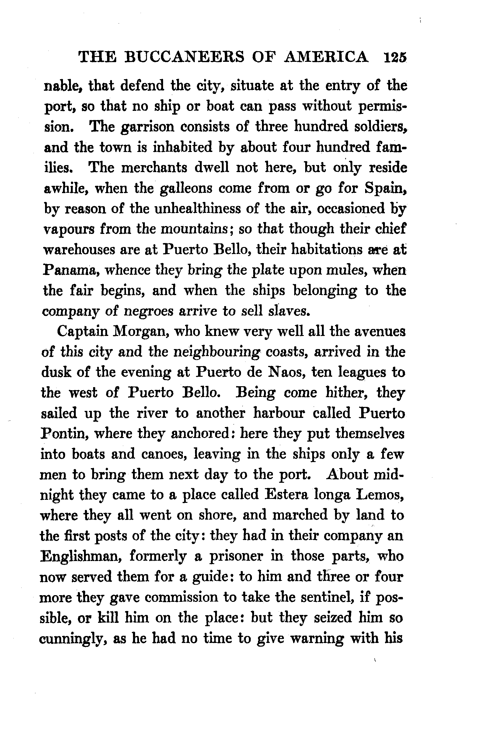 This contract being signed, Captain Morgan commanded his vice-admirals and captains to put all things in order, to attempt one of these three places; either Carthagena, Panama, or Vera Cruz. But the lot fell on Panama, as the richest of all three; though this city being situate at such a distance from the North Sea as they knew not well the approaches to it, they judged it necessary to go beforehand to the isle of St. Catherine, there to find some persons for guides in this enterprise; for in the garrison there are commonly many banditti and outlaws belonging to Panama and the neighbouring places, who are very expert in the knowledge of that country. But before they proceeded, they published an[178] act through the whole fleet, promising, if they met with any Spanish vessel, the first captain who should take it should have for his reward the tenth part of what should be found in her.[179]