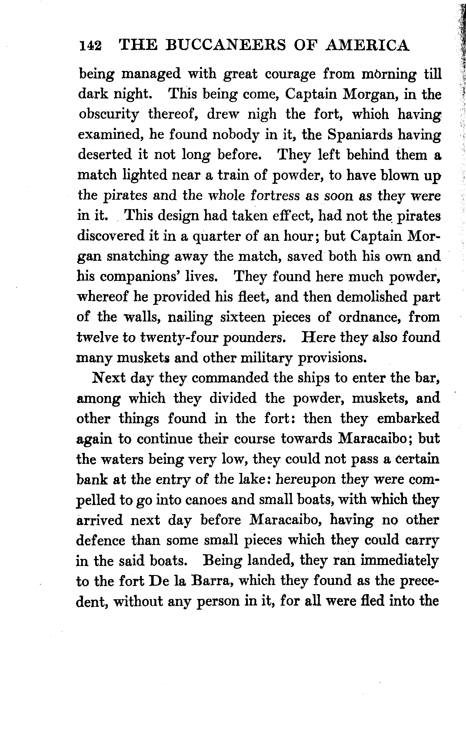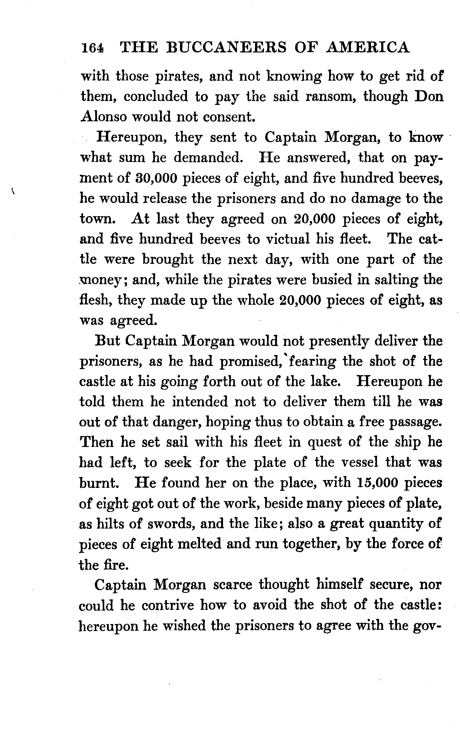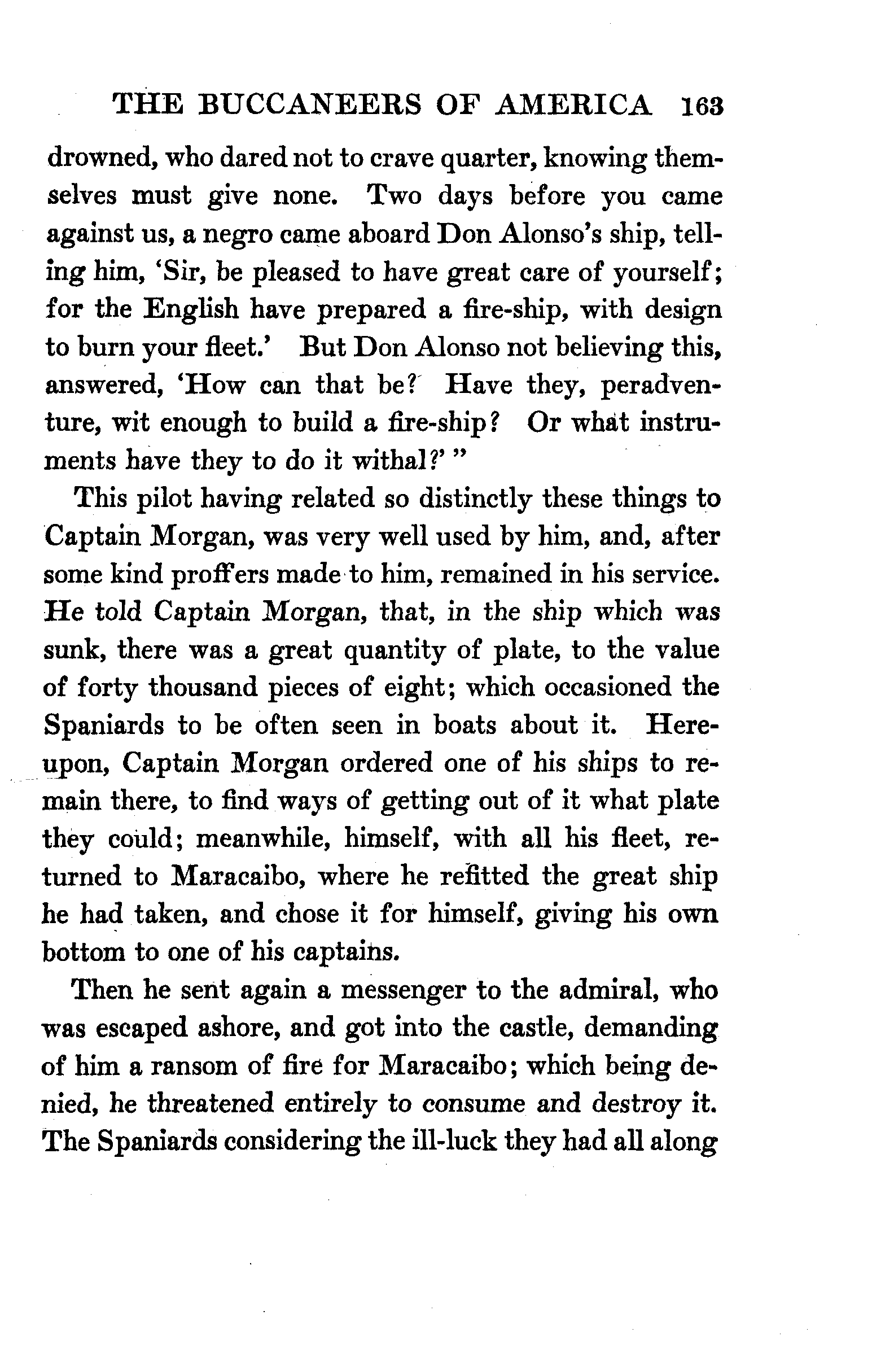 Then he sent again a messenger to the admiral, who was escaped ashore, and got into the castle, demanding of him a ransom of fire for Maracaibo; which being denied, he threatened entirely to consume and destroy it. The Spaniards considering the ill-luck they had all along[164] with those pirates, and not knowing how to get rid of them, concluded to pay the said ransom, though Don Alonso would not consent.