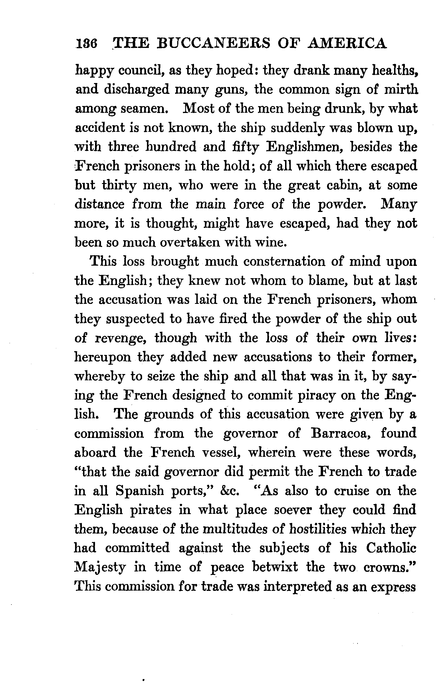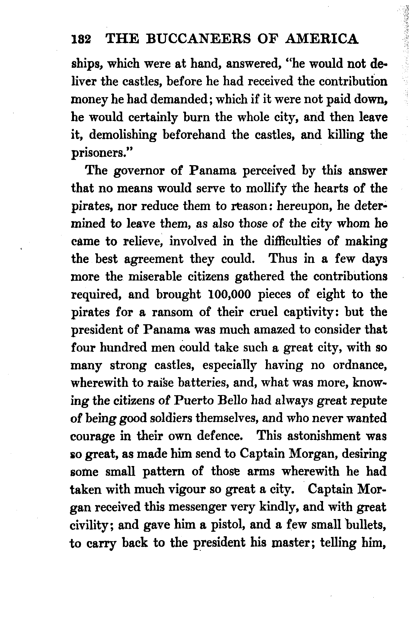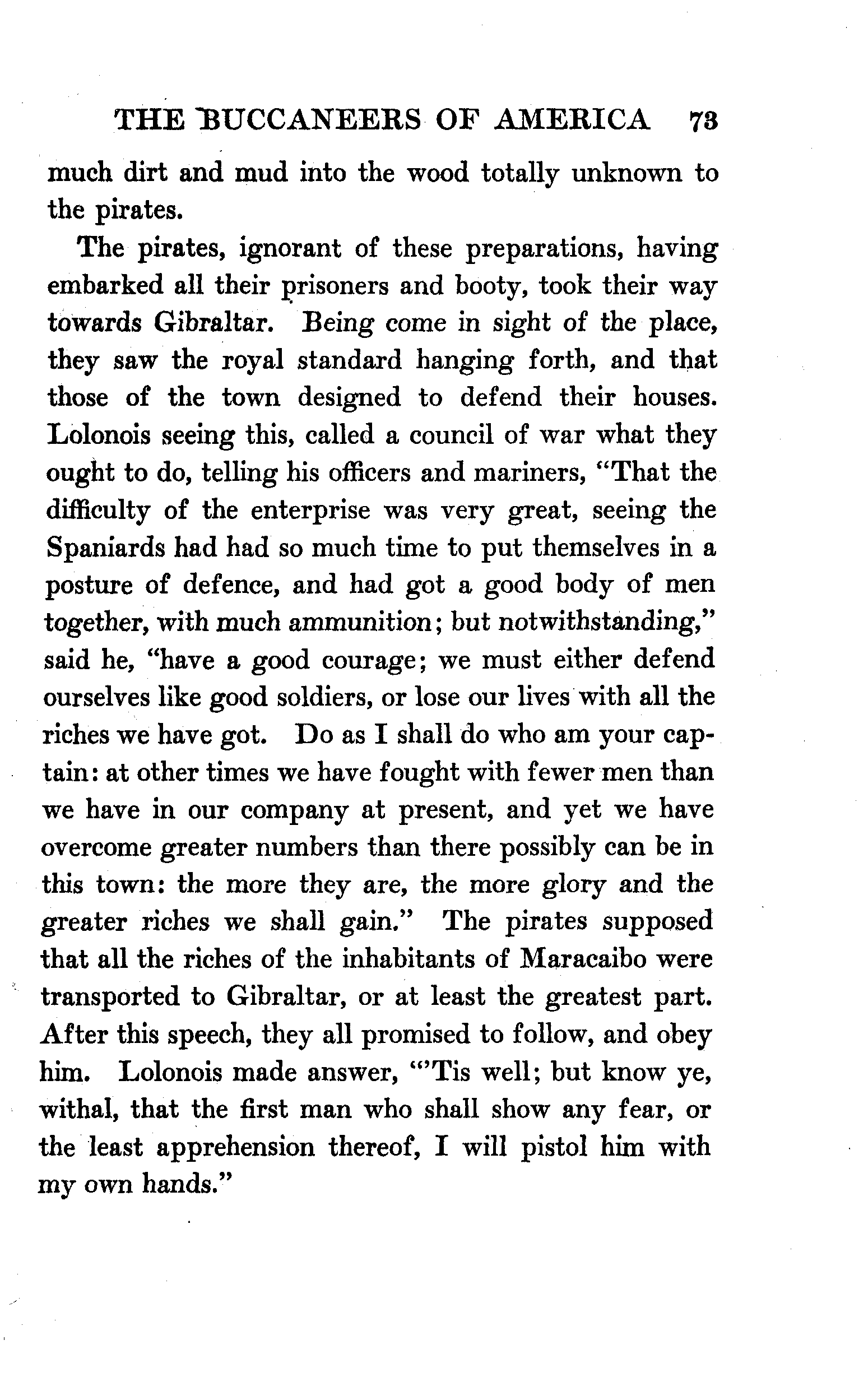 Then he sent again a messenger to the admiral, who was escaped ashore, and got into the castle, demanding of him a ransom of fire for Maracaibo; which being denied, he threatened entirely to consume and destroy it. The Spaniards considering the ill-luck they had all along[164] with those pirates, and not knowing how to get rid of them, concluded to pay the said ransom, though Don Alonso would not consent.