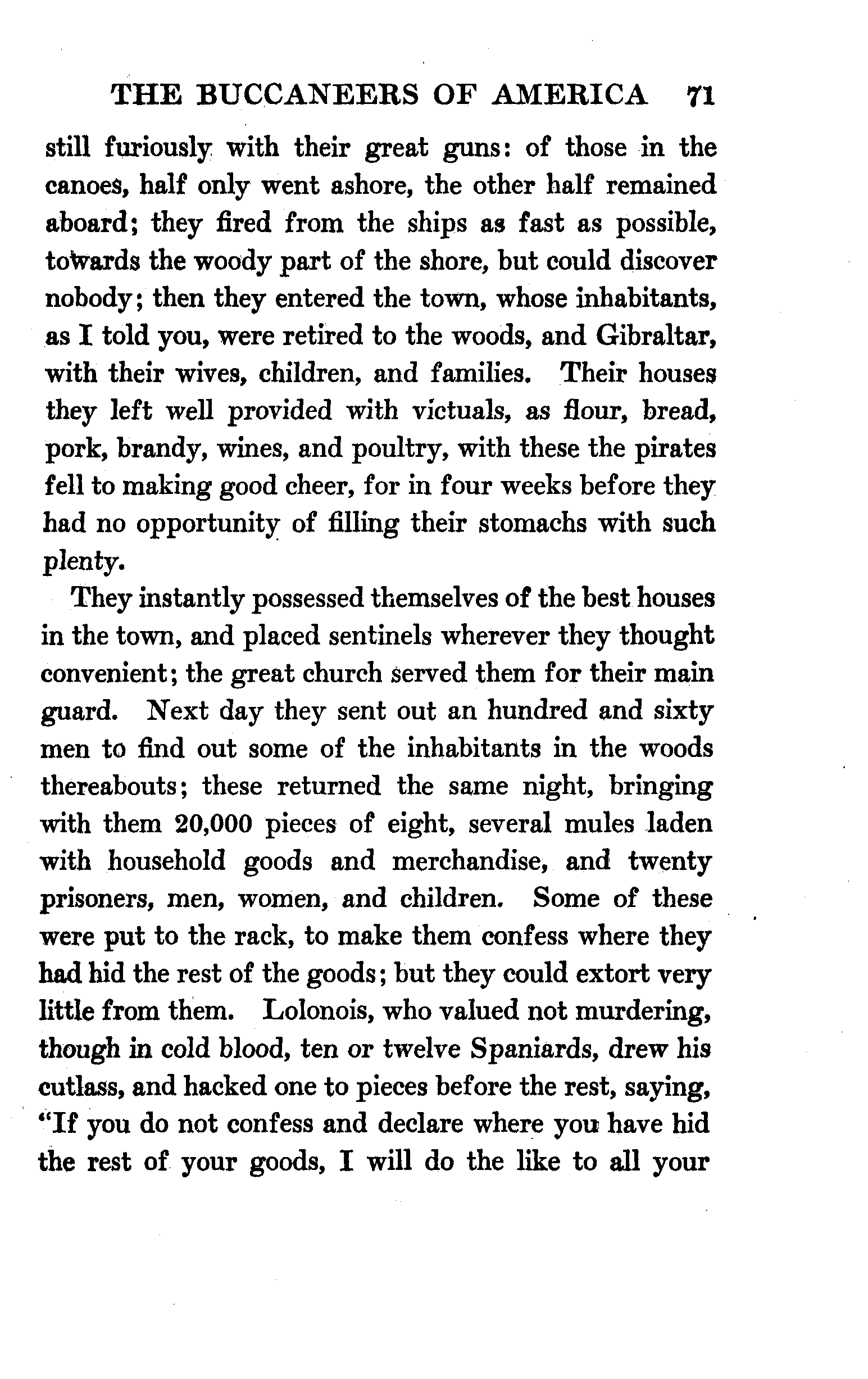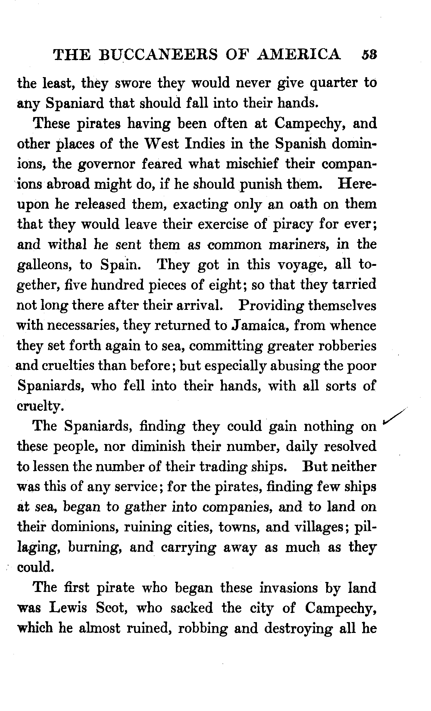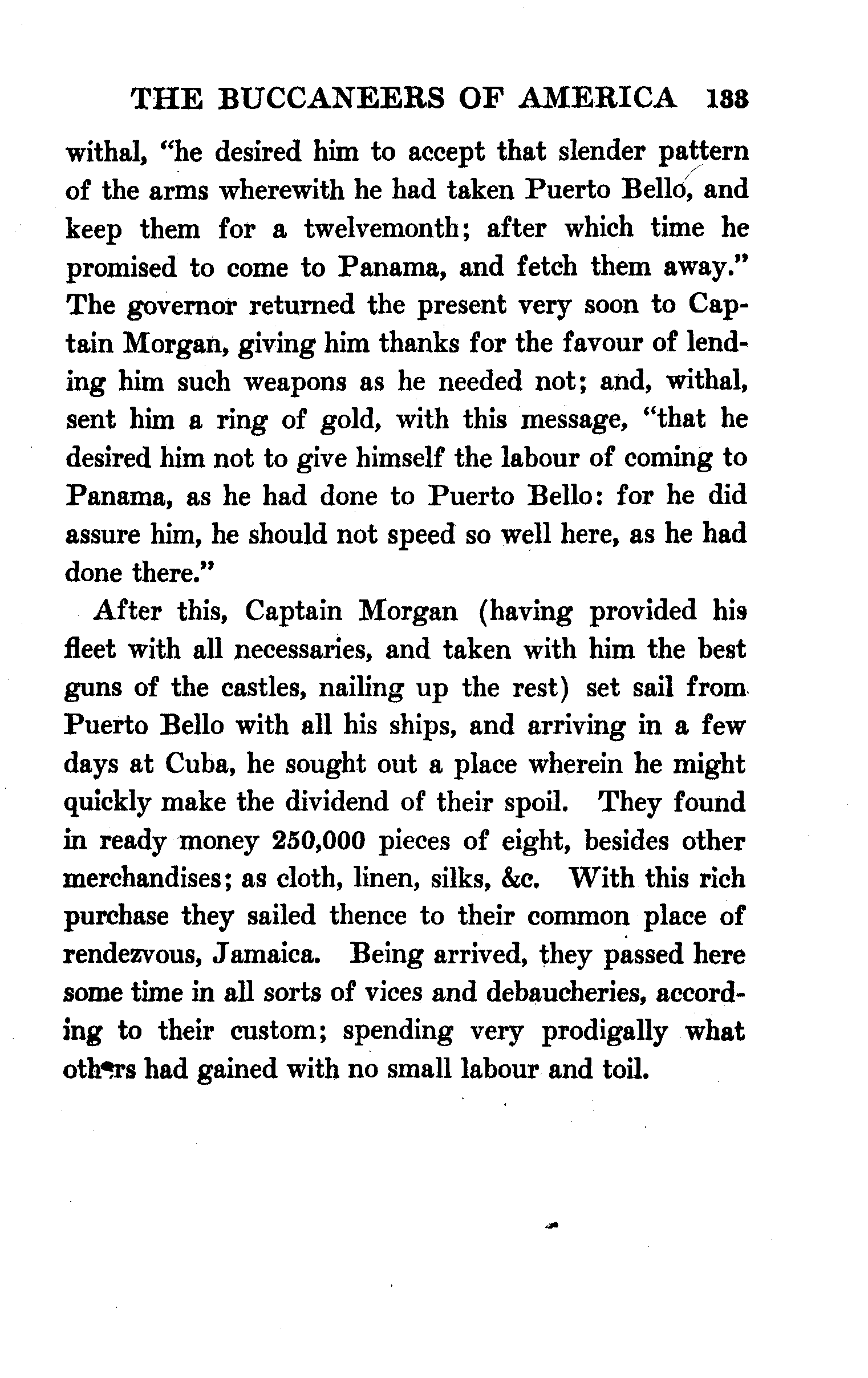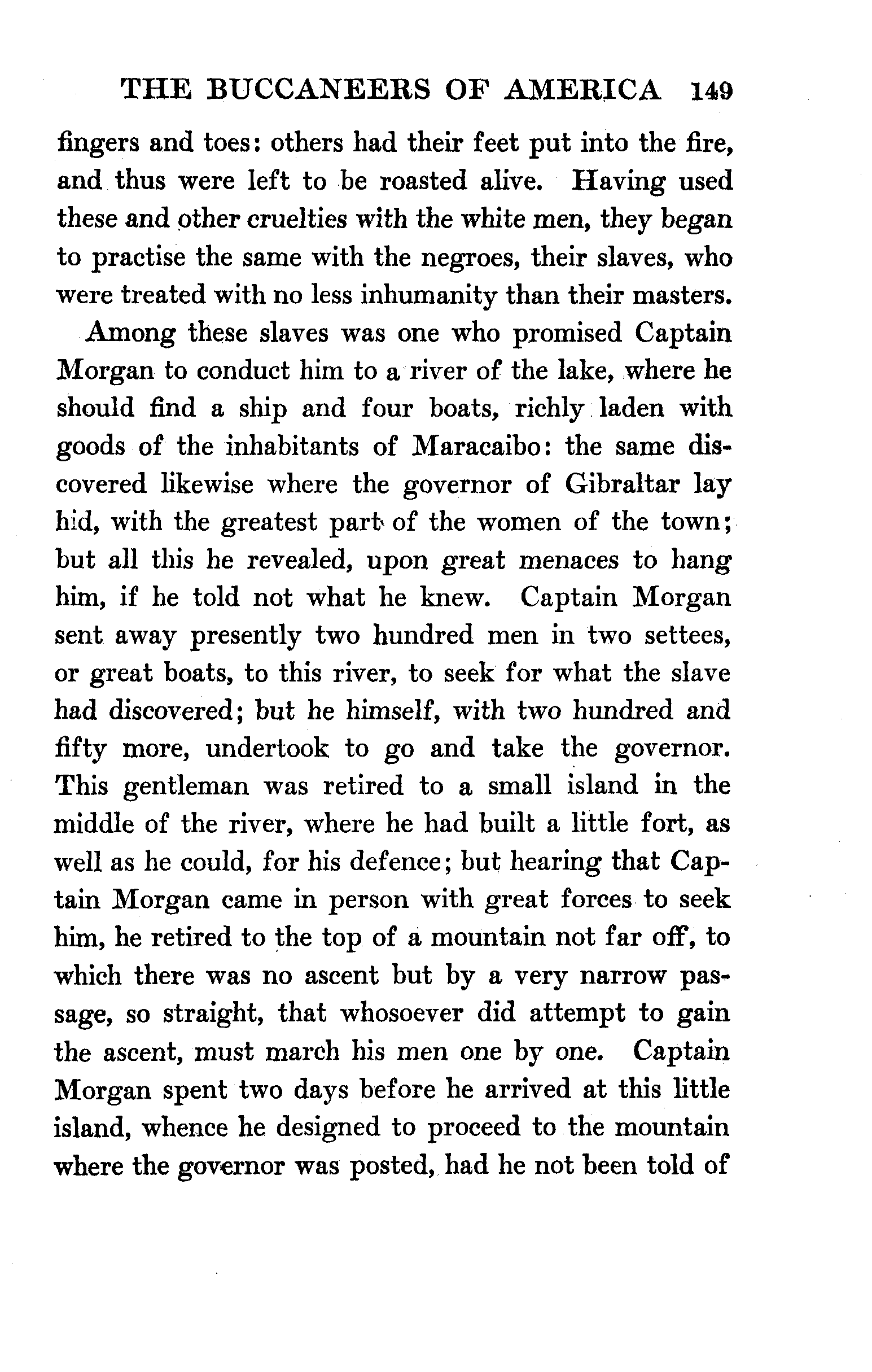 From time to time new editions of this work have been published, but in many cases much new material, not always authentic, has been added and the result has been to mar the original narrative as set forth by Esquemeling. In arranging this edition, the original English text only has been used, and but few changes made by cutting out the long and tedious description of plant and animal life of the West Indies of which Esquemeling had only a smattering of truth. But, the history of Captain Morgan and his fellow buccaneers is here printed almost identical with the original English translation, and we believe it is the first time this history has been published in a suitable form for the juvenile reader with no loss of interest to the adult.