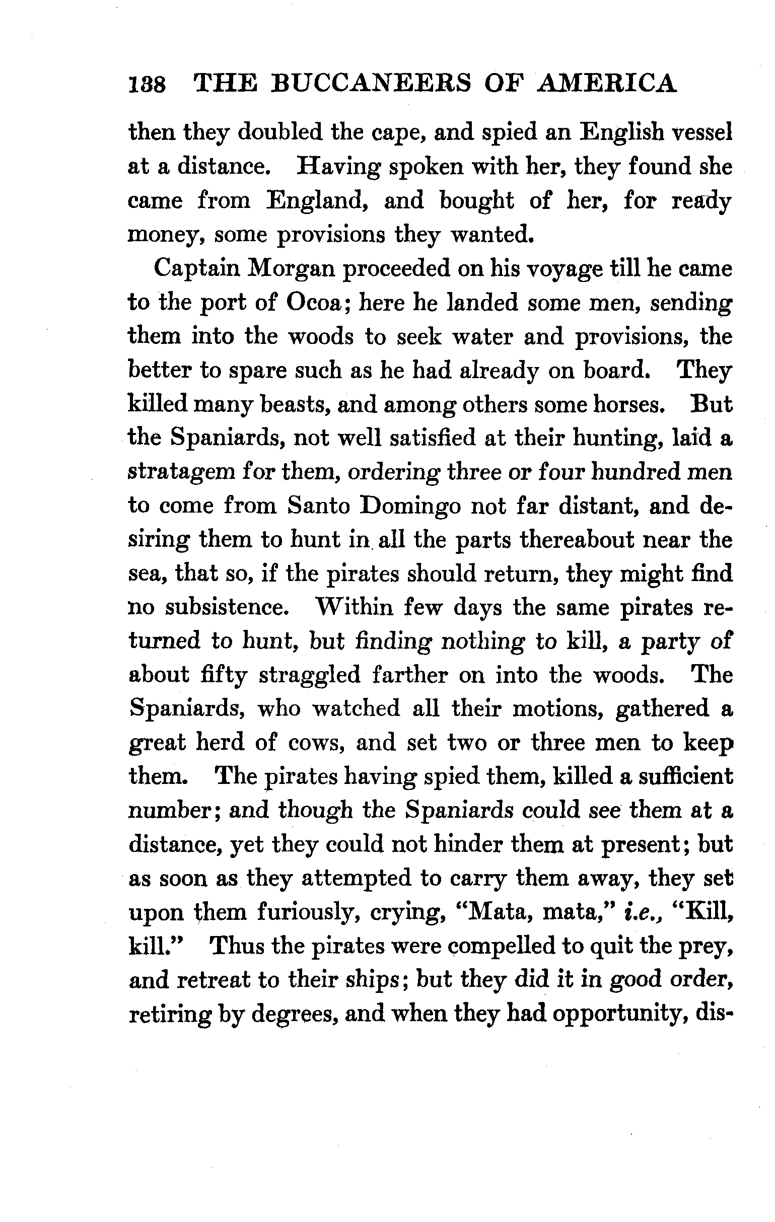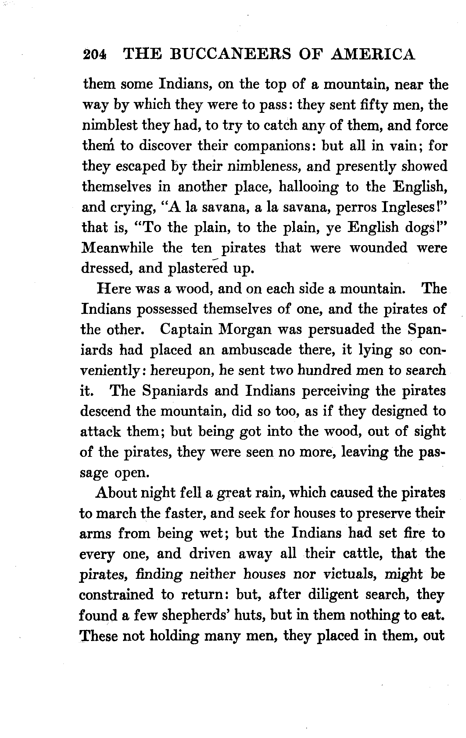 The pirates endeavoured to take some of the Indians prisoners, but they being swifter than the pirates, every one escaped, leaving eight pirates dead, and ten wounded: yea, had the Indians been more dextrous in military affairs, they might have defended that passage, and not let one man pass. A little while after they came to a large champaign, open, and full of fine meadows; hence they could perceive at a distance before[204] them some Indians, on the top of a mountain, near the way by which they were to pass: they sent fifty men, the nimblest they had, to try to catch any of them, and force them to discover their companions: but all in vain; for they escaped by their nimbleness, and presently showed themselves in another place, hallooing to the English, and crying, "A la savana, a la savana, perros Ingleses!" that is, "To the plain, to the plain, ye English dogs!" Meanwhile the ten pirates that were wounded were dressed, and plastered up.