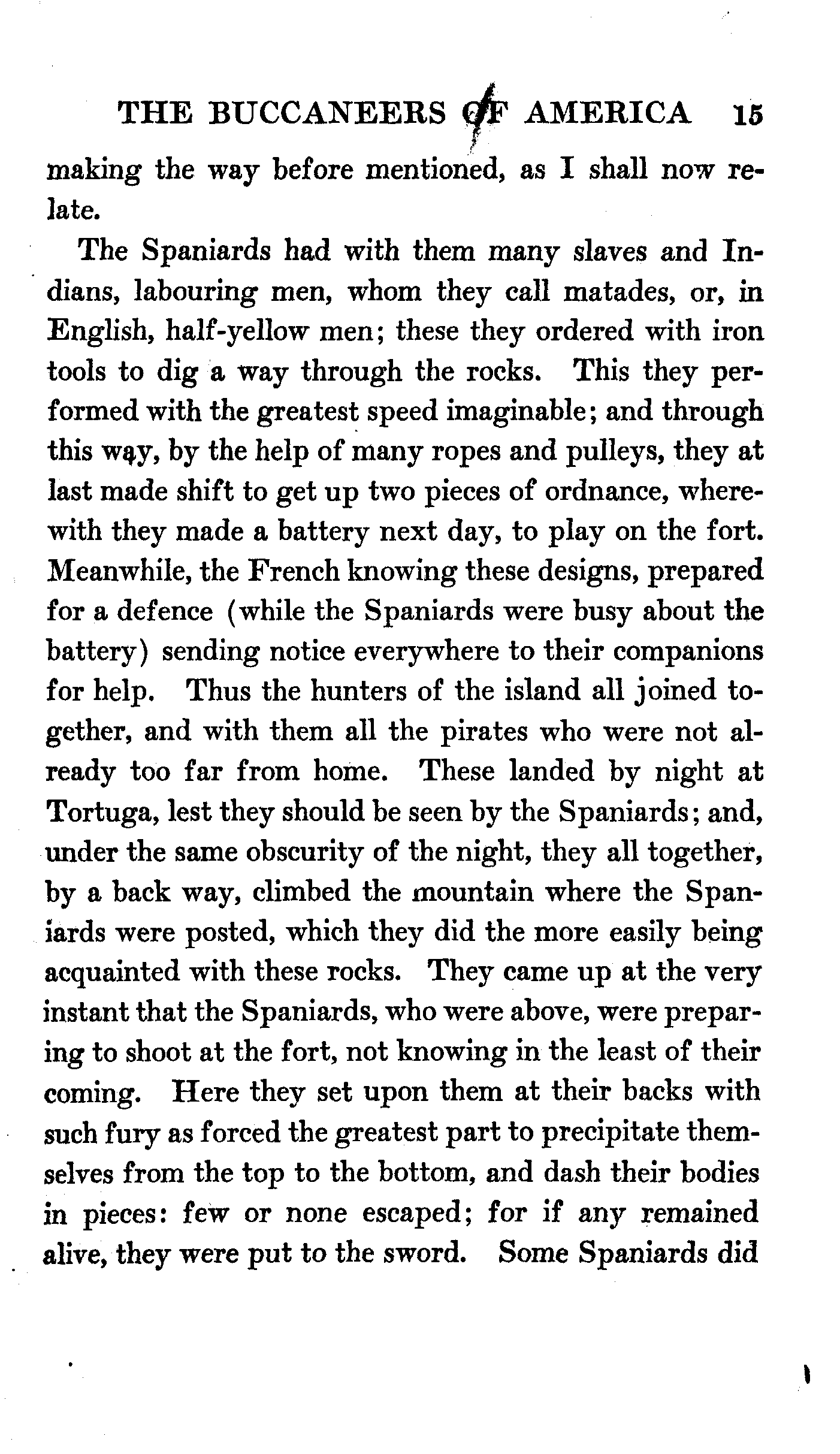 The Spaniards had with them many slaves and Indians, labouring men, whom they call matades, or, in English, half-yellow men; these they ordered with iron tools to dig a way through the rocks. This they performed with the greatest speed imaginable; and through this way, by the help of many ropes and pulleys, they at last made shift to get up two pieces of ordnance, wherewith they made a battery next day, to play on the fort. Meanwhile, the French knowing these designs, prepared for a defence (while the Spaniards were busy about the battery) sending notice everywhere to their companions for help. Thus the hunters of the island all joined together, and with them all the pirates who were not already too far from home. These landed by night at Tortuga, lest they should be seen by the Spaniards; and, under the same obscurity of the night, they all together, by a back way, climbed the mountain where the Spaniards were posted, which they did the more easily being acquainted with these rocks. They came up at the very instant that the Spaniards, who were above, were preparing to shoot at the fort, not knowing in the least of their coming. Here they set upon them at their backs with such fury as forced the greatest part to precipitate themselves from the top to the bottom, and dash their bodies in pieces: few or none escaped; for if any remained alive, they were put to the sword. Some Spaniards did[16] still keep the bottom of the mountain; but these, hearing the shrieks and cries of them that were killed, and believing some tragical revolution to be above, fled immediately towards the sea, despairing ever to regain the island of Tortuga.
