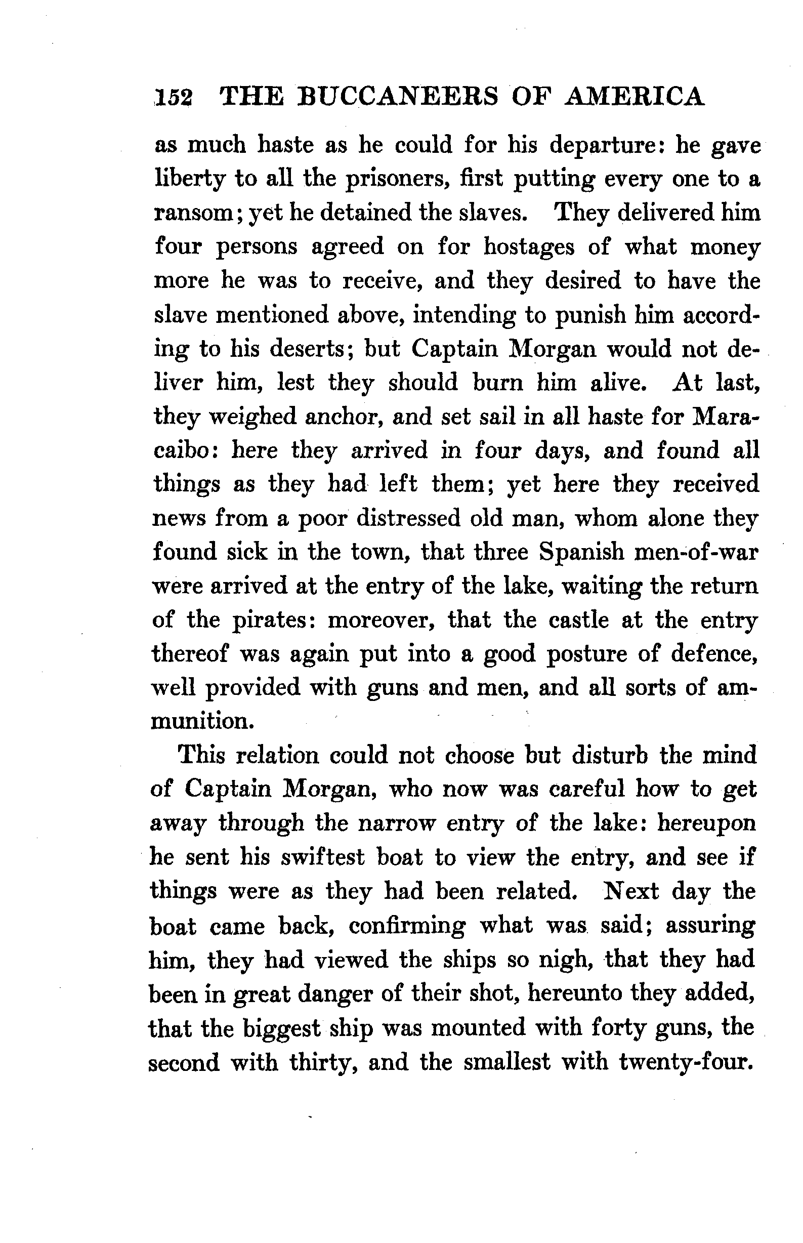 Captain Morgan having now been long absent from Maracaibo, and knowing the Spaniards had had sufficient time to fortify themselves, and hinder his departure out of the lake, granted their proposition, and made[152] as much haste as he could for his departure: he gave liberty to all the prisoners, first putting every one to a ransom; yet he detained the slaves. They delivered him four persons agreed on for hostages of what money more he was to receive, and they desired to have the slave mentioned above, intending to punish him according to his deserts; but Captain Morgan would not deliver him, lest they should burn him alive. At last, they weighed anchor, and set sail in all haste for Maracaibo: here they arrived in four days, and found all things as they had left them; yet here they received news from a poor distressed old man, whom alone they found sick in the town, that three Spanish men-of-war were arrived at the entry of the lake, waiting the return of the pirates: moreover, that the castle at the entry thereof was again put into a good posture of defence, well provided with guns and men, and all sorts of ammunition.