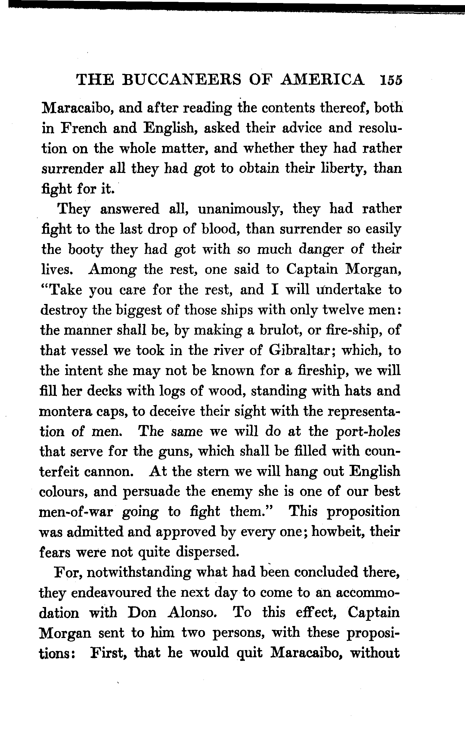 They answered all, unanimously, they had rather fight to the last drop of blood, than surrender so easily the booty they had got with so much danger of their lives. Among the rest, one said to Captain Morgan, "Take you care for the rest, and I will undertake to destroy the biggest of those ships with only twelve men: the manner shall be, by making a brulot, or fire-ship, of that vessel we took in the river of Gibraltar; which, to the intent she may not be known for a fireship, we will fill her decks with logs of wood, standing with hats and montera caps, to deceive their sight with the representation of men. The same we will do at the port-holes that serve for the guns, which shall be filled with counterfeit cannon. At the stern we will hang out English colours, and persuade the enemy she is one of our best men-of-war going to fight them." This proposition was admitted and approved by every one; howbeit, their fears were not quite dispersed.