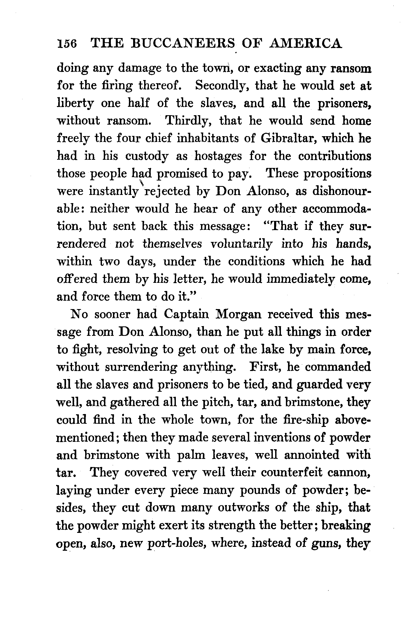 For, notwithstanding what had been concluded there, they endeavoured the next day to come to an accommodation with Don Alonso. To this effect, Captain Morgan sent to him two persons, with these propositions: First, that he would quit Maracaibo, without[156] doing any damage to the town, or exacting any ransom for the firing thereof. Secondly, that he would set at liberty one half of the slaves, and all the prisoners, without ransom. Thirdly, that he would send home freely the four chief inhabitants of Gibraltar, which he had in his custody as hostages for the contributions those people had promised to pay. These propositions were instantly rejected by Don Alonso, as dishonourable: neither would he hear of any other accommodation, but sent back this message: "That if they surrendered not themselves voluntarily into his hands, within two days, under the conditions which he had offered them by his letter, he would immediately come, and force them to do it."