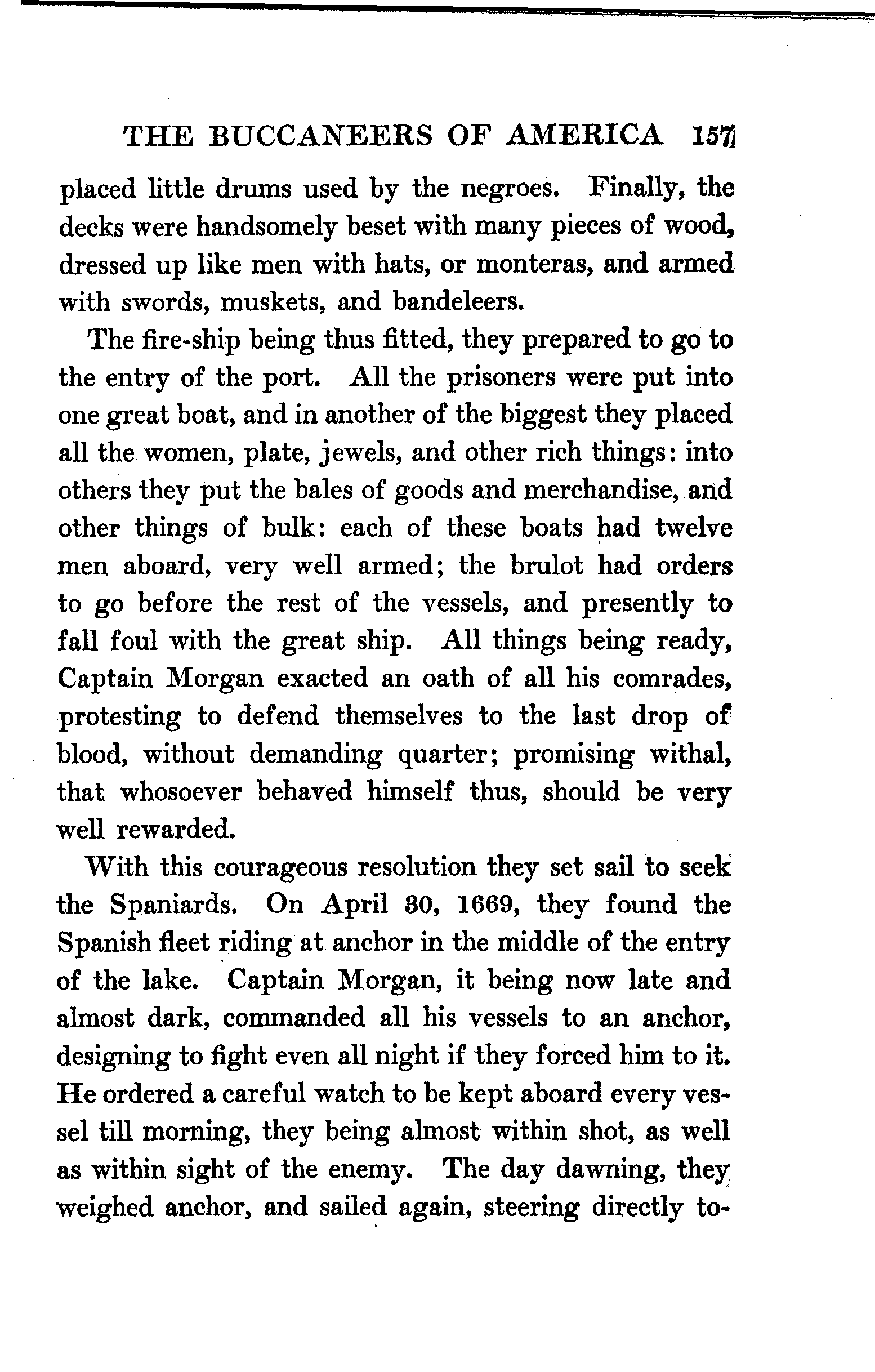 No sooner had Captain Morgan received this message from Don Alonso, than he put all things in order to fight, resolving to get out of the lake by main force, without surrendering anything. First, he commanded all the slaves and prisoners to be tied, and guarded very well, and gathered all the pitch, tar, and brimstone, they could find in the whole town, for the fire-ship above-mentioned; then they made several inventions of powder and brimstone with palm leaves, well annointed with tar. They covered very well their counterfeit cannon, laying under every piece many pounds of powder; besides, they cut down many outworks of the ship, that the powder might exert its strength the better; breaking open, also, new port-holes, where, instead of guns, they[157] placed little drums used by the negroes. Finally, the decks were handsomely beset with many pieces of wood, dressed up like men with hats, or monteras, and armed with swords, muskets, and bandeleers.