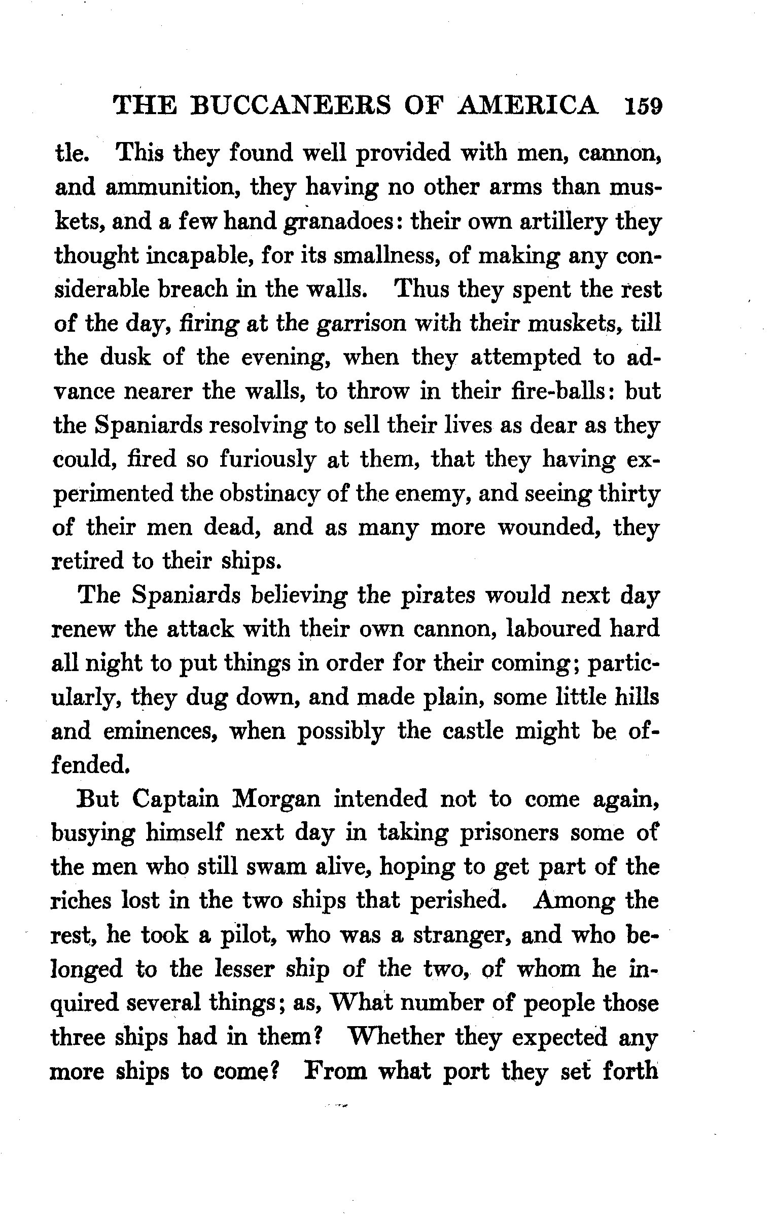 But Captain Morgan intended not to come again, busying himself next day in taking prisoners some of the men who still swam alive, hoping to get part of the riches lost in the two ships that perished. Among the rest, he took a pilot, who was a stranger, and who belonged to the lesser ship of the two, of whom he inquired several things; as, What number of people those three ships had in them? Whether they expected any more ships to come? From what port they set forth[160] last, when they came to seek them out? He answered, in Spanish, "Noble sir, be pleased to pardon and spare me, that no evil be done to me, being a stranger to this nation I have served, and I shall sincerely inform you of all that passed till our arrival at this lake. We were sent by orders from the Supreme Council of State in Spain, being six men-of-war well equipped, into these seas, with instructions to cruise upon the English pirates, and root them out from these parts by destroying as many of them as we could.