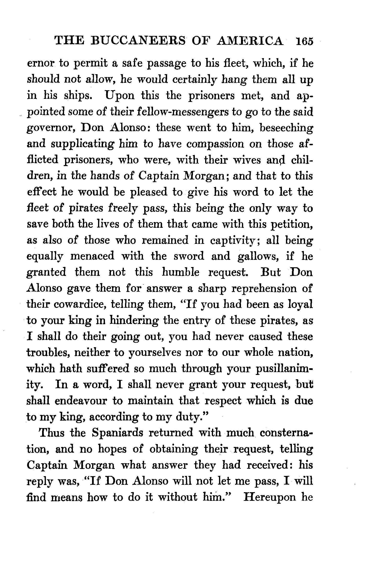 Captain Morgan scarce thought himself secure, nor could he contrive how to avoid the shot of the castle: hereupon he wished the prisoners to agree with the gov[165]ernor to permit a safe passage to his fleet, which, if he should not allow, he would certainly hang them all up in his ships. Upon this the prisoners met, and appointed some of their fellow-messengers to go to the said governor, Don Alonso: these went to him, beseeching and supplicating him to have compassion on those afflicted prisoners, who were, with their wives and children, in the hands of Captain Morgan; and that to this effect he would be pleased to give his word to let the fleet of pirates freely pass, this being the only way to save both the lives of them that came with this petition, as also of those who remained in captivity; all being equally menaced with the sword and gallows, if he granted them not this humble request. But Don Alonso gave them for answer a sharp reprehension of their cowardice, telling them, "If you had been as loyal to your king in hindering the entry of these pirates, as I shall do their going out, you had never caused these troubles, neither to yourselves nor to our whole nation, which hath suffered so much through your pusillanimity. In a word, I shall never grant your request, but shall endeavour to maintain that respect which is due to my king, according to my duty."