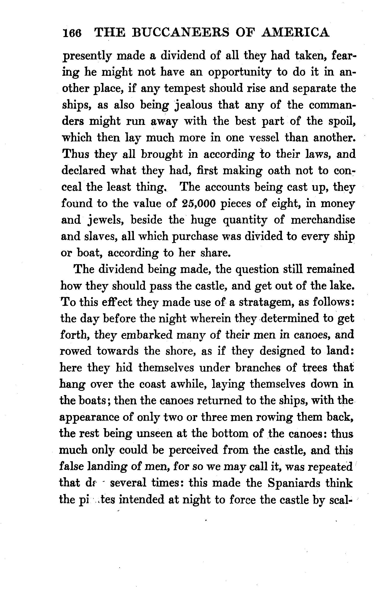 The dividend being made, the question still remained how they should pass the castle, and get out of the lake. To this effect they made use of a stratagem, as follows: the day before the night wherein they determined to get forth, they embarked many of their men in canoes, and rowed towards the shore, as if they designed to land: here they hid themselves under branches of trees that hang over the coast awhile, laying themselves down in the boats; then the canoes returned to the ships, with the appearance of only two or three men rowing them back, the rest being unseen at the bottom of the canoes: thus much only could be perceived from the castle, and this false landing of men, for so we may call it, was repeated that day several times: this made the Spaniards think the pirates intended at night to force the castle by scal[167]ing it. This fear caused them to place most of their great guns on the land side, together with their main force, leaving the side towards the sea almost destitute of defence.