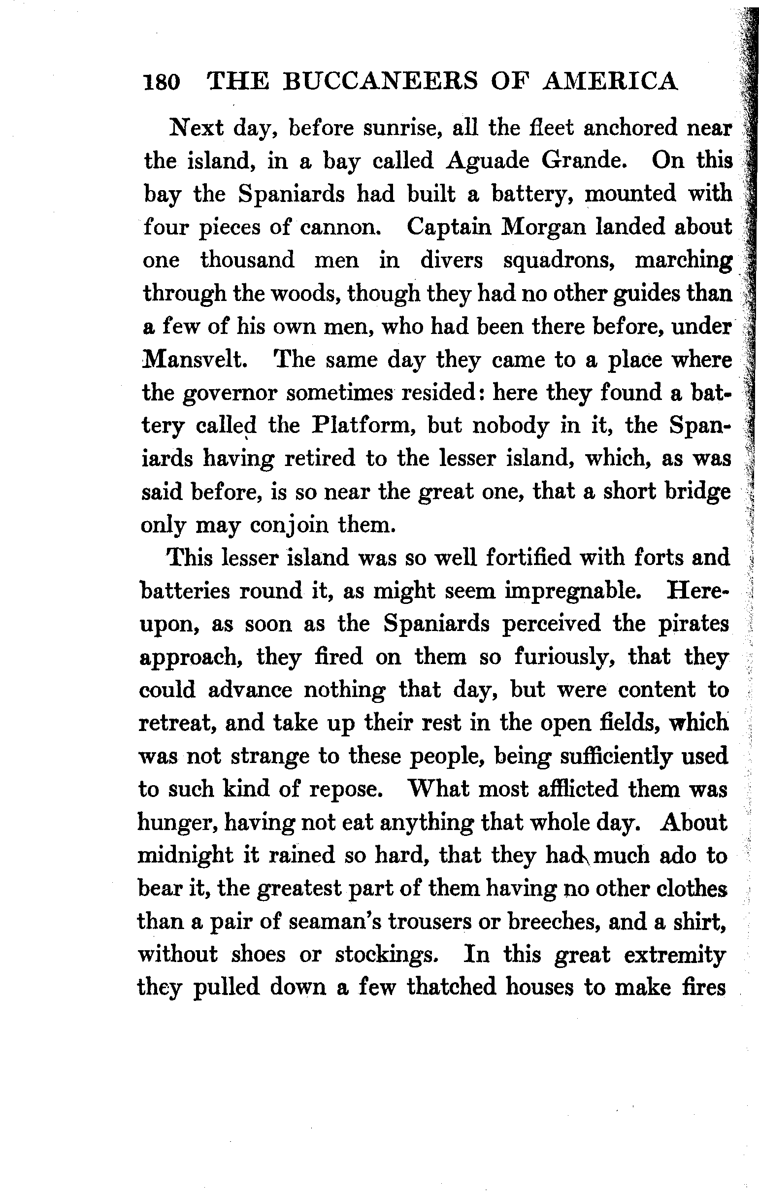 This lesser island was so well fortified with forts and batteries round it, as might seem impregnable. Hereupon, as soon as the Spaniards perceived the pirates approach, they fired on them so furiously, that they could advance nothing that day, but were content to retreat, and take up their rest in the open fields, which was not strange to these people, being sufficiently used to such kind of repose. What most afflicted them was hunger, having not eat anything that whole day. About midnight it rained so hard, that they had much ado to bear it, the greatest part of them having no other clothes than a pair of seaman's trousers or breeches, and a shirt, without shoes or stockings. In this great extremity they pulled down a few thatched houses to make fires[181] withal; in a word, they were in such a condition, that one hundred men, indifferently well armed, might easily that night have torn them all in pieces. Next morning, about break of day, the rain ceased, and they dried their arms and marched on: but soon after it rained afresh, rather harder than before, as if the skies were melted into waters; which kept them from advancing towards the forts, whence the Spaniards continually fired at them.