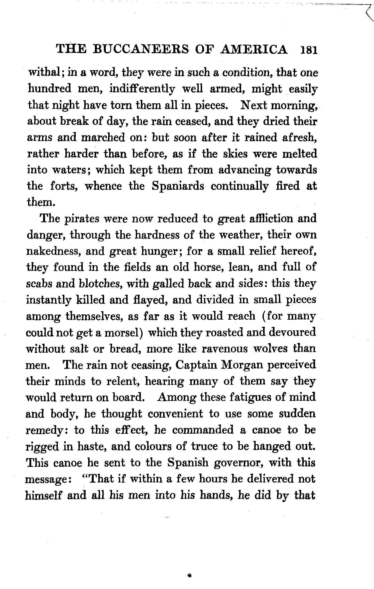 The pirates were now reduced to great affliction and danger, through the hardness of the weather, their own nakedness, and great hunger; for a small relief hereof, they found in the fields an old horse, lean, and full of scabs and blotches, with galled back and sides: this they instantly killed and flayed, and divided in small pieces among themselves, as far as it would reach (for many could not get a morsel) which they roasted and devoured without salt or bread, more like ravenous wolves than men. The rain not ceasing, Captain Morgan perceived their minds to relent, hearing many of them say they would return on board. Among these fatigues of mind and body, he thought convenient to use some sudden remedy: to this effect, he commanded a canoe to be rigged in haste, and colours of truce to be hanged out. This canoe he sent to the Spanish governor, with this message: "That if within a few hours he delivered not himself and all his men into his hands, he did by that[182] messenger swear to him, and all those that were in his company, he would most certainly put them to the sword, without granting quarter to any."