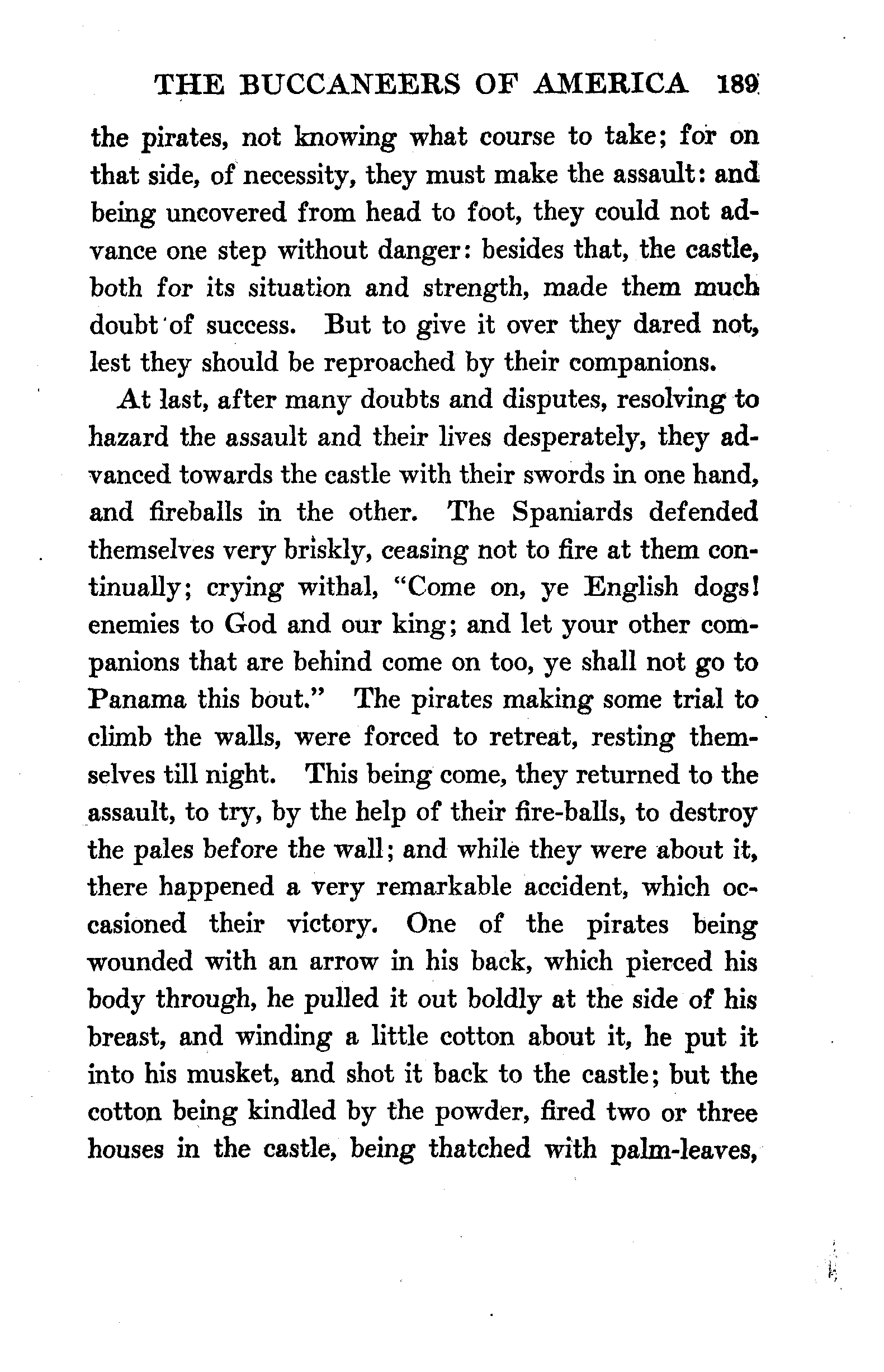 At last, after many doubts and disputes, resolving to hazard the assault and their lives desperately, they advanced towards the castle with their swords in one hand, and fire-balls in the other. The Spaniards defended themselves very briskly, ceasing not to fire at them continually; crying withal, "Come on, ye English dogs! enemies to God and our king; and let your other companions that are behind come on too, ye shall not go to Panama this bout." The pirates making some trial to climb the walls, were forced to retreat, resting themselves till night. This being come, they returned to the assault, to try, by the help of their fire-balls, to destroy the pales before the wall; and while they were about it, there happened a very remarkable accident, which occasioned their victory. One of the pirates being wounded with an arrow in his back, which pierced his body through, he pulled it out boldly at the side of his breast, and winding a little cotton about it, he put it into his musket, and shot it back to the castle; but the cotton being kindled by the powder, fired two or three houses in the castle, being thatched with palm-leaves,[190] which the Spaniards perceived not so soon as was necessary; for this fire meeting with a parcel of powder, blew it up, thereby causing great ruin, and no less consternation to the Spaniards, who were not able to put a stop to it, not having seen it time enough.