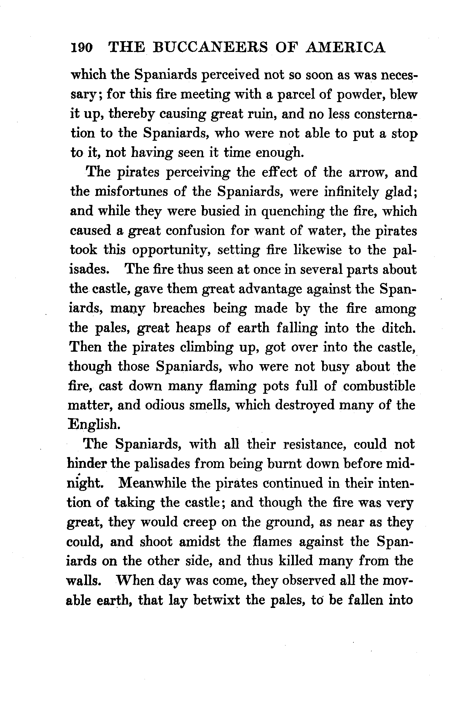 The pirates perceiving the effect of the arrow, and the misfortunes of the Spaniards, were infinitely glad; and while they were busied in quenching the fire, which caused a great confusion for want of water, the pirates took this opportunity, setting fire likewise to the palisades. The fire thus seen at once in several parts about the castle, gave them great advantage against the Spaniards, many breaches being made by the fire among the pales, great heaps of earth falling into the ditch. Then the pirates climbing up, got over into the castle, though those Spaniards, who were not busy about the fire, cast down many flaming pots full of combustible matter, and odious smells, which destroyed many of the English.