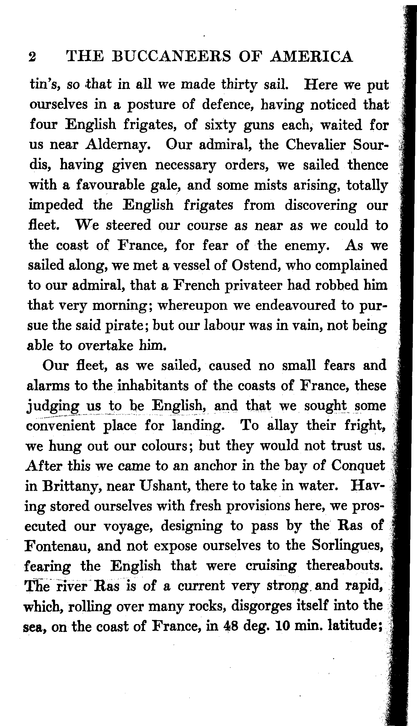 Our fleet, as we sailed, caused no small fears and alarms to the inhabitants of the coasts of France, these judging us to be English, and that we sought some convenient place for landing. To allay their fright, we hung out our colours; but they would not trust us. After this we came to an anchor in the bay of Conquet in Brittany, near Ushant, there to take in water. Having stored ourselves with fresh provisions here, we prosecuted our voyage, designing to pass by the Ras of Fontenau, and not expose ourselves to the Sorlingues, fearing the English that were cruising thereabouts. The river Ras is of a current very strong and rapid, which, rolling over many rocks, disgorges itself into the sea, on the coast of France, in 48 deg. 10 min. latitude;[3] so that this passage is very dangerous, all the rocks, as yet, being not thoroughly known.