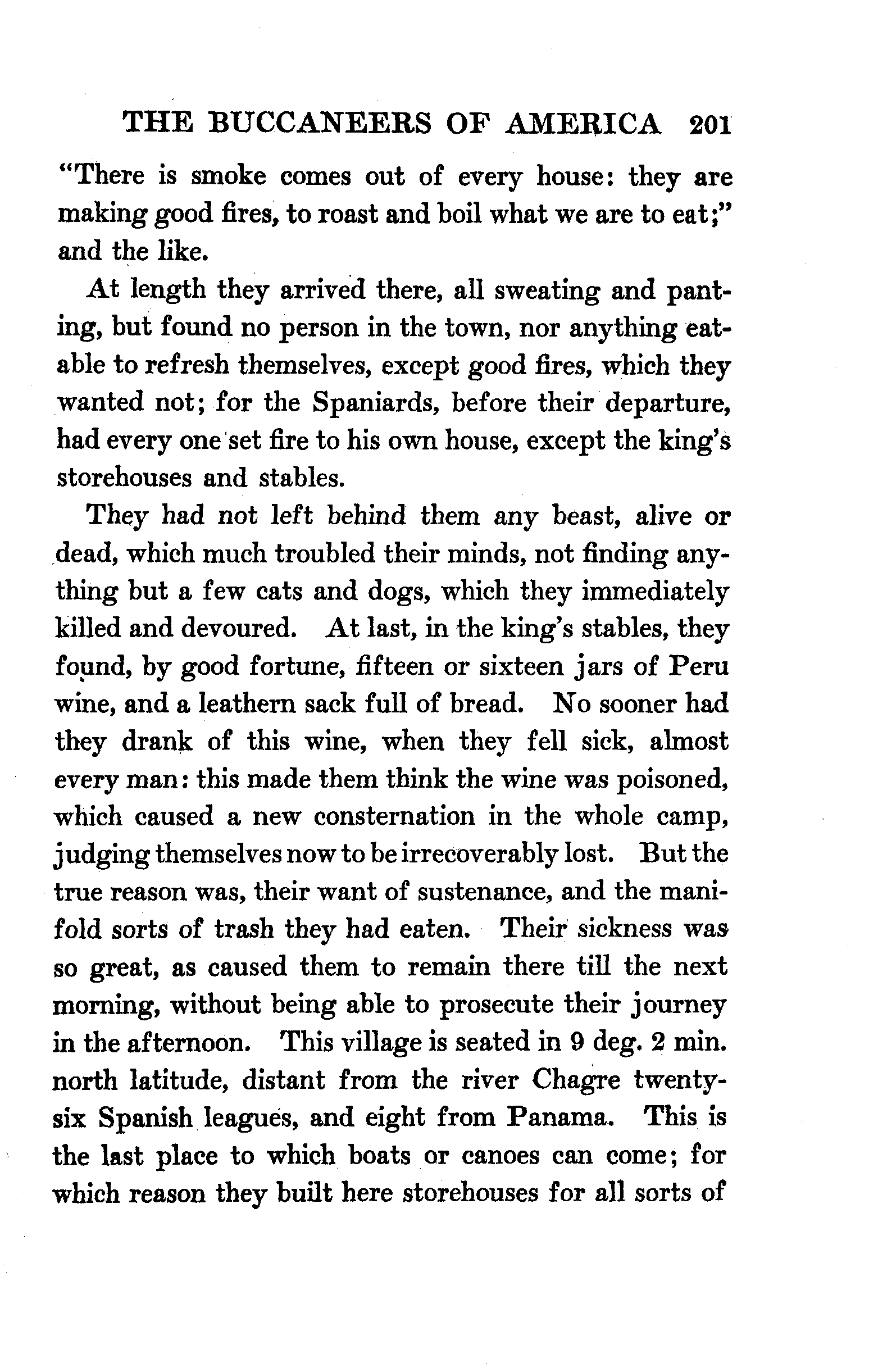 They had not left behind them any beast, alive or dead, which much troubled their minds, not finding anything but a few cats and dogs, which they immediately killed and devoured. At last, in the king's stables, they found, by good fortune, fifteen or sixteen jars of Peru wine, and a leathern sack full of bread. No sooner had they drank of this wine, when they fell sick, almost every man: this made them think the wine was poisoned, which caused a new consternation in the whole camp, judging themselves now to be irrecoverably lost. But the true reason was, their want of sustenance, and the manifold sorts of trash they had eaten. Their sickness was so great, as caused them to remain there till the next morning, without being able to prosecute their journey in the afternoon. This village is seated in 9 deg. 2 min. north latitude, distant from the river Chagre twenty-six Spanish leagues, and eight from Panama. This is the last place to which boats or canoes can come; for which reason they built here storehouses for all sorts of[202] merchandise, which to and from Panama are transported on the backs of mules.