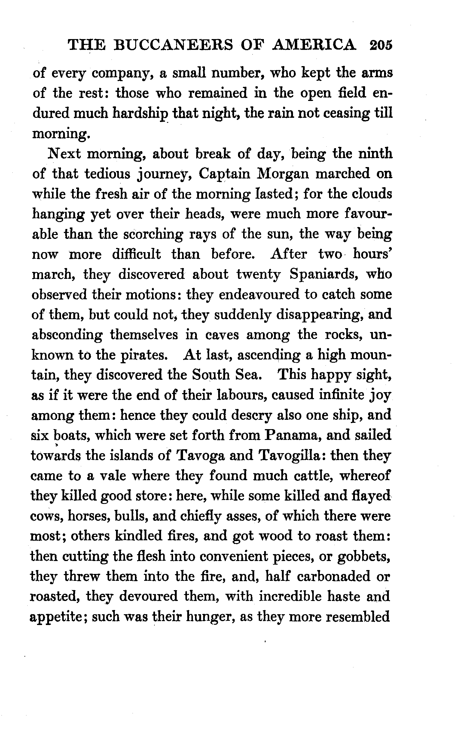 Next morning, about break of day, being the ninth of that tedious journey, Captain Morgan marched on while the fresh air of the morning lasted; for the clouds hanging yet over their heads, were much more favourable than the scorching rays of the sun, the way being now more difficult than before. After two hours' march, they discovered about twenty Spaniards, who observed their motions: they endeavoured to catch some of them, but could not, they suddenly disappearing, and absconding themselves in caves among the rocks, unknown to the pirates. At last, ascending a high mountain, they discovered the South Sea. This happy sight, as if it were the end of their labours, caused infinite joy among them: hence they could descry also one ship, and six boats, which were set forth from Panama, and sailed towards the islands of Tavoga and Tavogilla: then they came to a vale where they found much cattle, whereof they killed good store: here, while some killed and flayed cows, horses, bulls, and chiefly asses, of which there were most; others kindled fires, and got wood to roast them: then cutting the flesh into convenient pieces, or gobbets, they threw them into the fire, and, half carbonaded or roasted, they devoured them, with incredible haste and appetite; such was their hunger, as they more resembled[206] cannibals than Europeans; the blood many times running down from their beards to their waists.