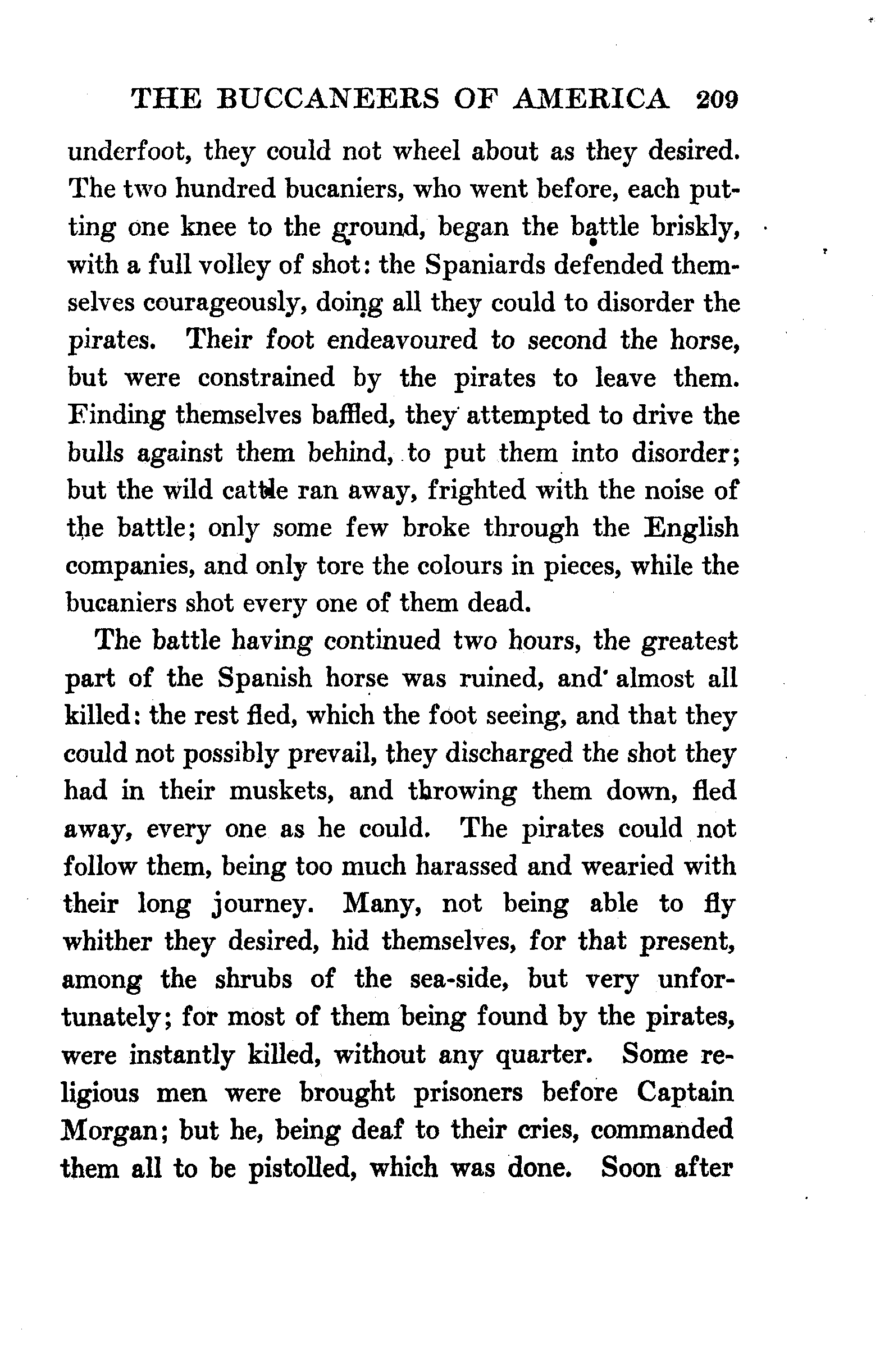 The pirates, now upon their march, came to the top of a little hill, whence they had a large prospect of the city and champaign country underneath. Here they discovered the forces of the people of Panama, in battle array, to be so numerous, that they were surprised with fear, much doubting the fortune of the day: yea, few or none there were but wished themselves at home, or at least free from the obligation of that engagement, it so nearly concerning their lives. Having been some time wavering in their minds, they at last reflected on the straits they had brought themselves into, and that now they must either fight resolutely, or die; for no quarter could be expected from an enemy on whom they had committed so many cruelties. Hereupon they encouraged one another, resolving to conquer, or spend the last drop of blood. Then they divided themselves into three battalions, sending before two hundred bucaniers, who were very dextrous at their guns. Then descending the hill, they marched directly towards the Spaniards, who in a spacious field waited for their coming. As soon as they drew nigh, the Spaniards began to shout and cry, "Viva el rey!" "God save the king!" and immediately their horse moved against the pirates: but the fields being full of quags, and soft[209] underfoot, they could not wheel about as they desired. The two hundred bucaniers, who went before, each putting one knee to the ground, began the battle briskly, with a full volley of shot: the Spaniards defended themselves courageously, doing all they could to disorder the pirates. Their foot endeavoured to second the horse, but were constrained by the pirates to leave them. Finding themselves baffled, they attempted to drive the bulls against them behind, to put them into disorder; but the wild cattle ran away, frighted with the noise of the battle; only some few broke through the English companies, and only tore the colours in pieces, while the bucaniers shot every one of them dead.