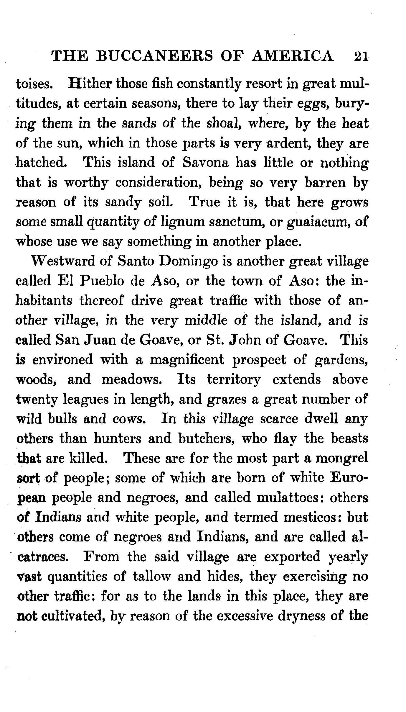 Westward of Santo Domingo is another great village called El Pueblo de Aso, or the town of Aso: the inhabitants thereof drive great traffic with those of another village, in the very middle of the island, and is called San Juan de Goave, or St. John of Goave. This is environed with a magnificent prospect of gardens, woods, and meadows. Its territory extends above twenty leagues in length, and grazes a great number of wild bulls and cows. In this village scarce dwell any others than hunters and butchers, who flay the beasts that are killed. These are for the most part a mongrel sort of people; some of which are born of white European people and negroes, and called mulattoes: others of Indians and white people, and termed mesticos: but others come of negroes and Indians, and are called alcatraces. From the said village are exported yearly vast quantities of tallow and hides, they exercising no other traffic: for as to the lands in this place, they are not cultivated, by reason of the excessive dryness of the[22] soil. These are the chiefest places that the Spaniards possess in this island, from the Cape of Lobos towards St. John de Goave, unto the Cape of Samana nigh the sea, on the north side, and from the eastern part towards the sea, called Punta de Espada. All the rest of the island is possessed by the French, who are also planters and hunters.