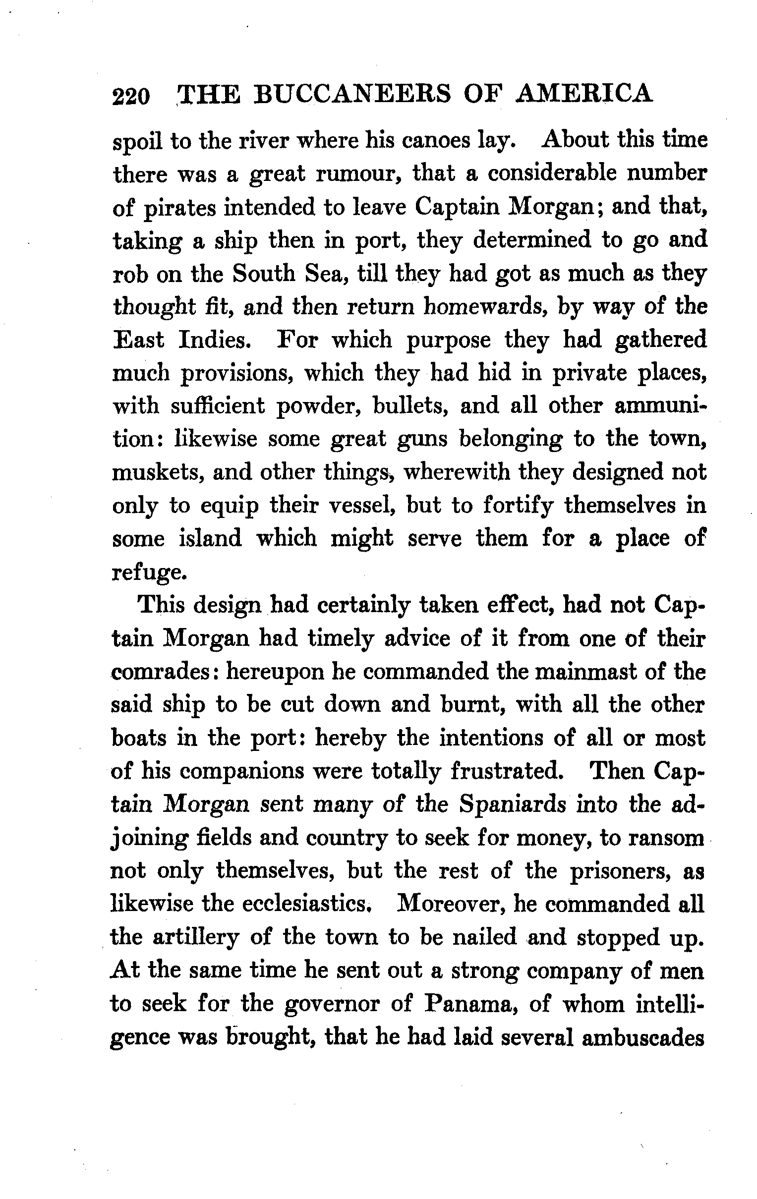 Captain Morgan having now been at Panama full three weeks, commanded all things to be prepared for his departure. He ordered every company of men to seek so many beasts of carriage as might convey the[220] spoil to the river where his canoes lay. About this time there was a great rumour, that a considerable number of pirates intended to leave Captain Morgan; and that, taking a ship then in port, they determined to go and rob on the South Sea, till they had got as much as they thought fit, and then return homewards, by way of the East Indies. For which purpose they had gathered much provisions, which they had hid in private places, with sufficient powder, bullets, and all other ammunition: likewise some great guns belonging to the town, muskets, and other things, wherewith they designed not only to equip their vessel, but to fortify themselves in some island which might serve them for a place of refuge.