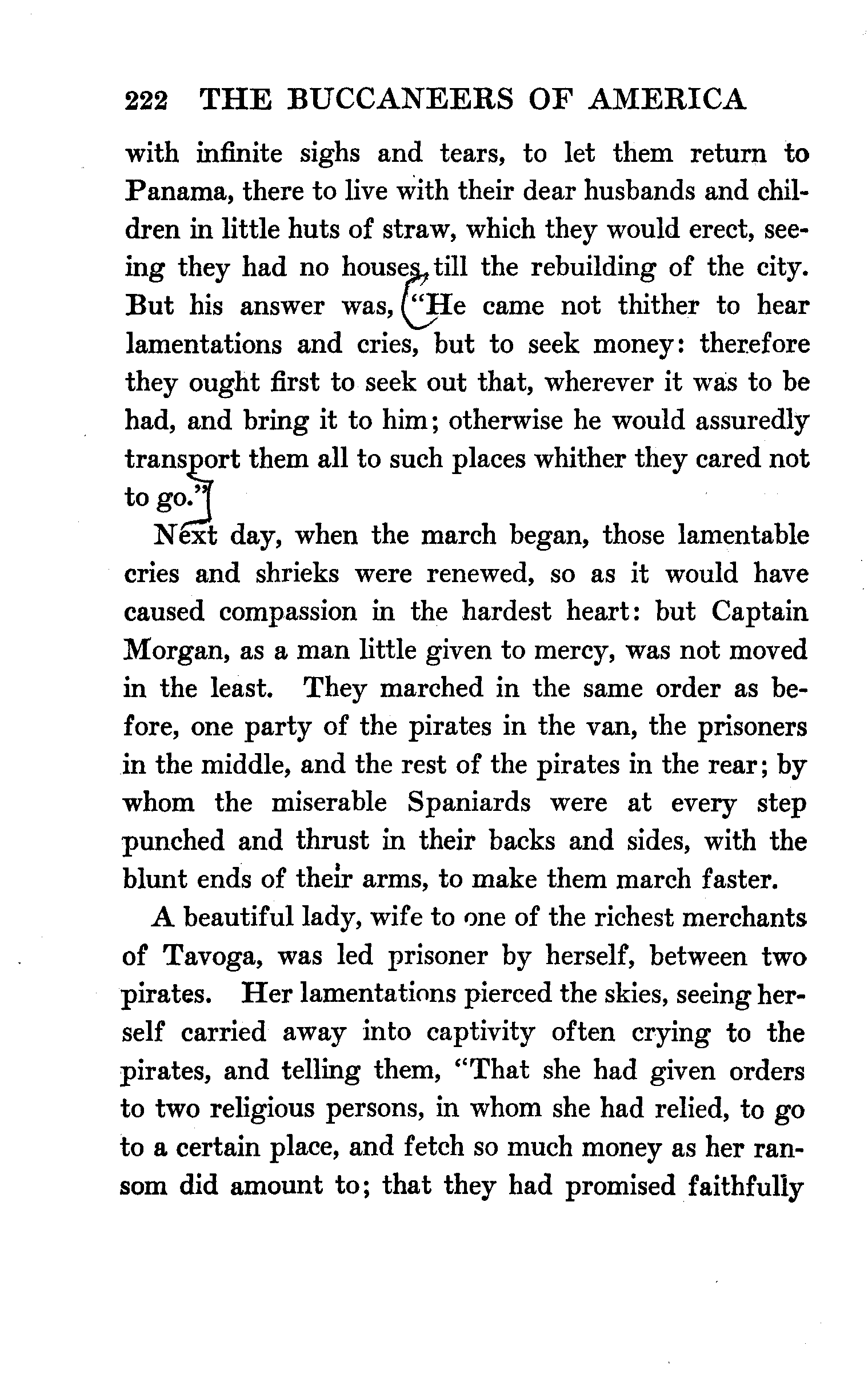 February 24, 1671, Captain Morgan departed from Panama, or rather from the place where the city of Panama stood; of the spoils whereof he carried with him one hundred and seventy-five beasts of carriage, laden with silver, gold, and other precious things, beside about six hundred prisoners, men, women, children and slaves. That day they came to a river that passes through a delicious plain, a league from Panama: here Captain Morgan put all his forces into good order, so as that the prisoners were in the middle, surrounded on all sides with pirates, where nothing else was to be heard but lamentations, cries, shrieks, and doleful sighs of so many women and children, who feared Captain Morgan designed to transport them all into his own country for slaves. Besides, all those miserable prisoners endured extreme hunger and thirst at that time, which misery Captain Morgan designedly caused them to sustain, to excite them to seek for money to ransom themselves, according to the tax he had set upon every one. Many of the women begged Captain Morgan, on their knees,[222] with infinite sighs and tears, to let them return to Panama, there to live with their dear husbands and children in little huts of straw, which they would erect, seeing they had no houses till the rebuilding of the city. But his answer was, "He came not thither to hear lamentations and cries, but to seek money: therefore they ought first to seek out that, wherever it was to be had, and bring it to him; otherwise he would assuredly transport them all to such places whither they cared not to go."