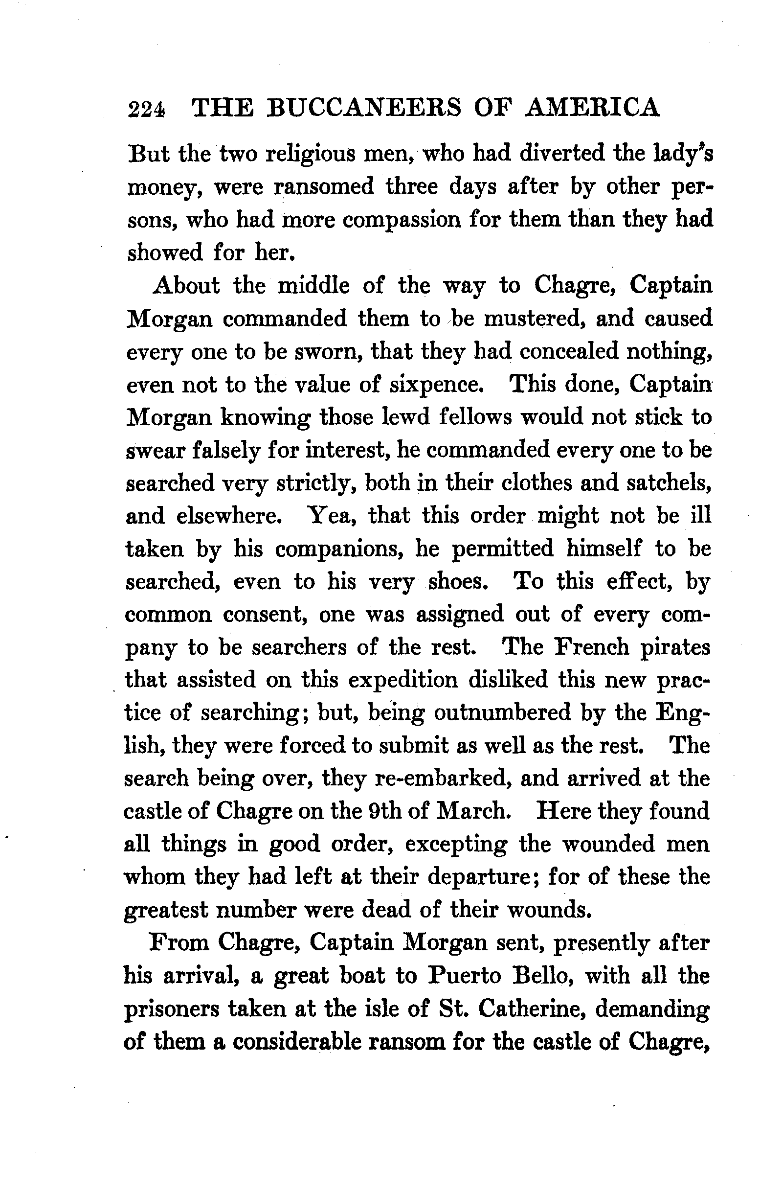 About the middle of the way to Chagre, Captain Morgan commanded them to be mustered, and caused every one to be sworn, that they had concealed nothing, even not to the value of sixpence. This done, Captain Morgan knowing those lewd fellows would not stick to swear falsely for interest, he commanded every one to be searched very strictly, both in their clothes and satchels, and elsewhere. Yea, that this order might not be ill taken by his companions, he permitted himself to be searched, even to his very shoes. To this effect, by common consent, one was assigned out of every company to be searchers of the rest. The French pirates that assisted on this expedition disliked this new practice of searching; but, being outnumbered by the English, they were forced to submit as well as the rest. The search being over, they re-embarked, and arrived at the castle of Chagre on the 9th of March. Here they found all things in good order, excepting the wounded men whom they had left at their departure; for of these the greatest number were dead of their wounds.